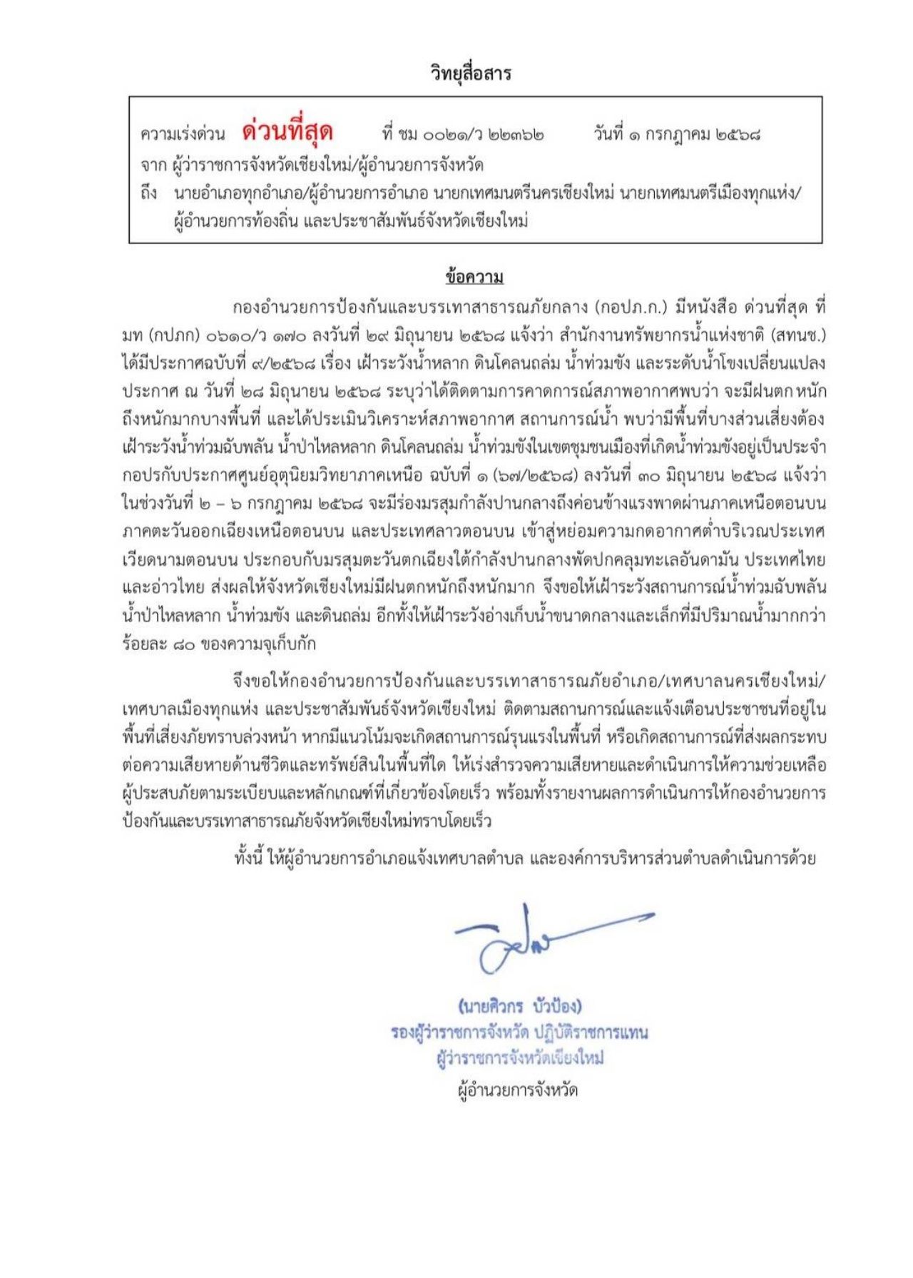 วันที่ 2 กรกฎาคม 2568 ผู้ว่าราชการจังหวัดเชียงใหม่ นายนิรัตน์ พงษ์สิทธิถาวร มีหนังสือด่วนที่สุดผ่านทางวิทยุสื่อสาร แจ้งเตือนทั้ง 25 อำเภอ ให้เฝ้าระวังน้ำท่วมฉับพลัน น้ำป่าไหลหลาก ดินโคลนถล่มและน้ำท่วมขังในเขตชุมชนเมือง
