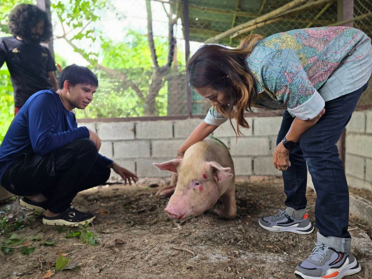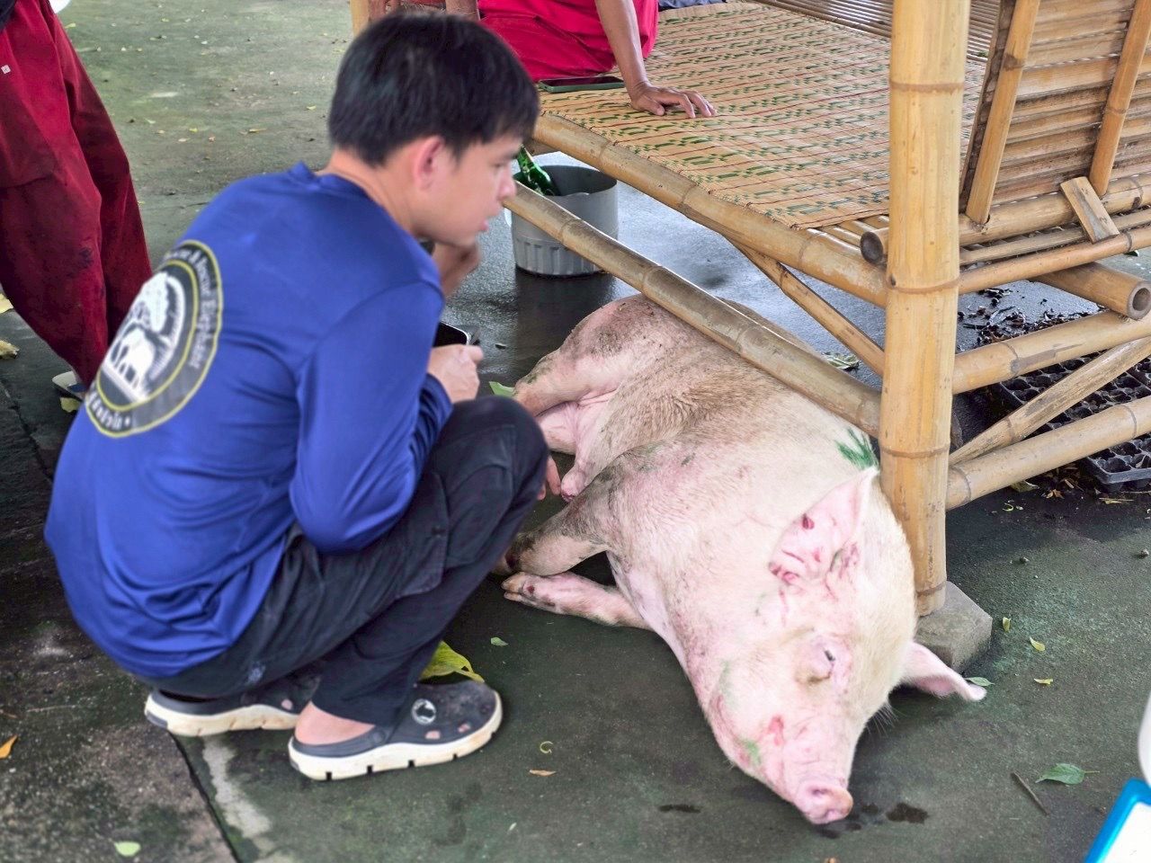 นางสาวปิยาภรณ์ ปินธง เจ้าของร้านค้าใกล้ที่เกิดเหตุ ผู้เห็นเหตุการณ์ เผยว่า ได้ยินเสียงดังคล้ายรถชนจึงรีบวิ่งออกมาดู พบหมูตัวใหญ่ มีอาการบาดเจ็บ เนื้อตัวถลอกหลายจุด และมีเลือดไหลออก จึงรีบเข้าให้ความช่วยเหลือเบื้องต้น ทำความสะอาดบาดแผล และใช้น้ำฉีดเพื่อคลายความตึงเครียดของสัตว์