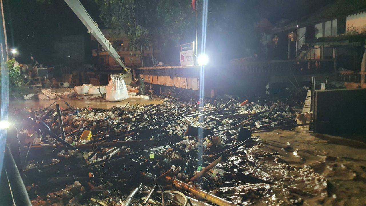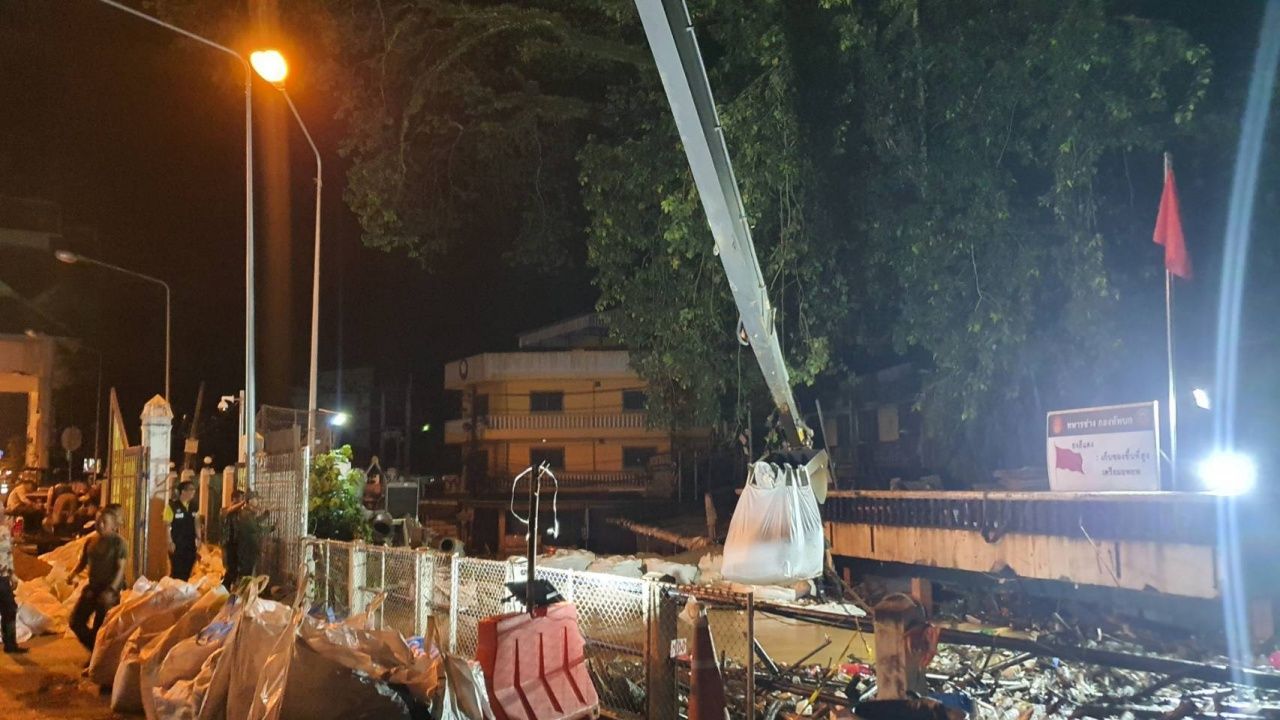 นอกจากจะให้ความช่วยเหลือประชาชนที่ได้รับผลกระทบแล้ว เจ้าหน้าที่และอาสากู้ภัยยังต้องช่วยกันขจัดขอนไม้และขยะปฏิกูลต่างๆ ที่ลอยมากับน้ำแล้วมาอัดแน่นอยู่บริเวณสะพานข้ามลำน้ำสายแห่งที่ 1 ซึ่งไปทำให้กีดขวางทางเดินของน้ำทำให้น้ำไหลได้ไม่สะดวก ส่งผลทำให้ระดับน้ำบริเวณสะพานพรมแดน ยิ่งเพิ่มระดับจนเอ่อไหลเข้าท่วมสูงขึ้น นอกจากนั้นยังได้มีการติดตั้งเครื่องสูบน้ำขนาดใหญ่ ที่บริเวณสะพานพรมแดนสูบน้ำที่ทะลุพนังป้องกันน้ำท่วมจากจุดต่างๆ ออกจากพื้นที่อีกด้วย
