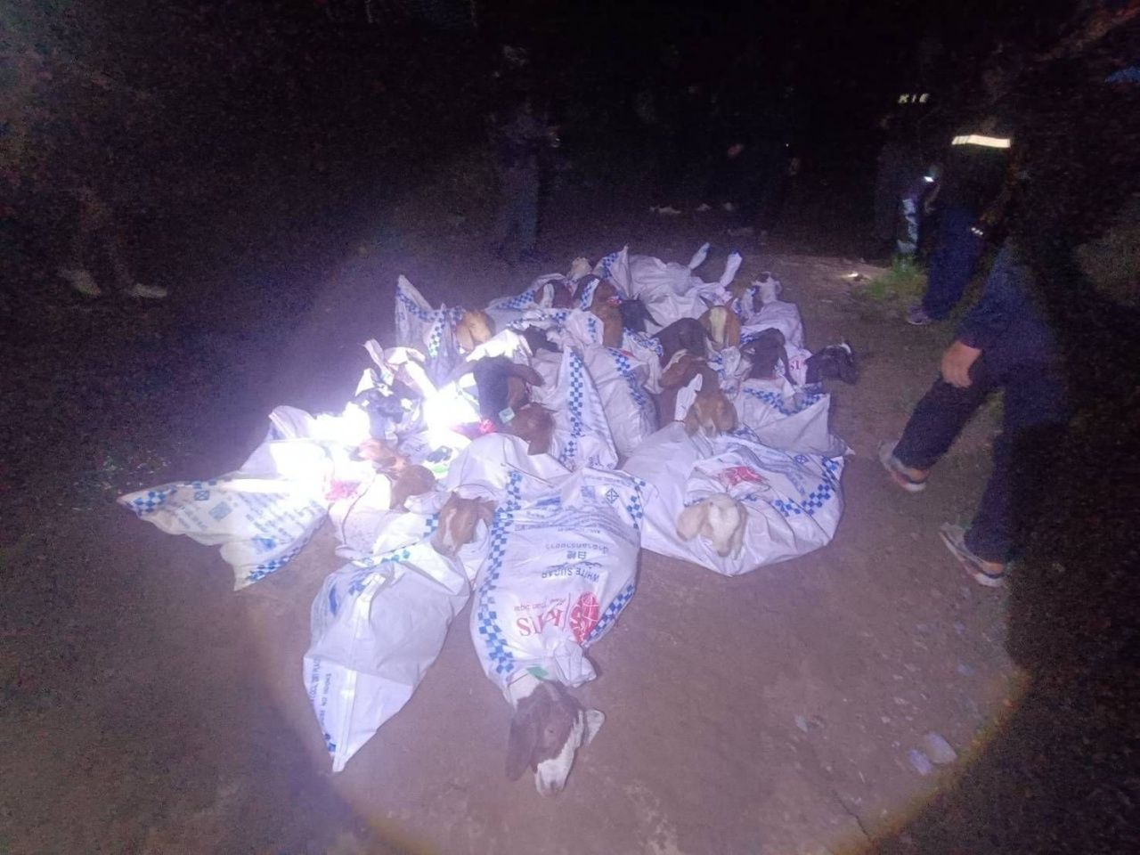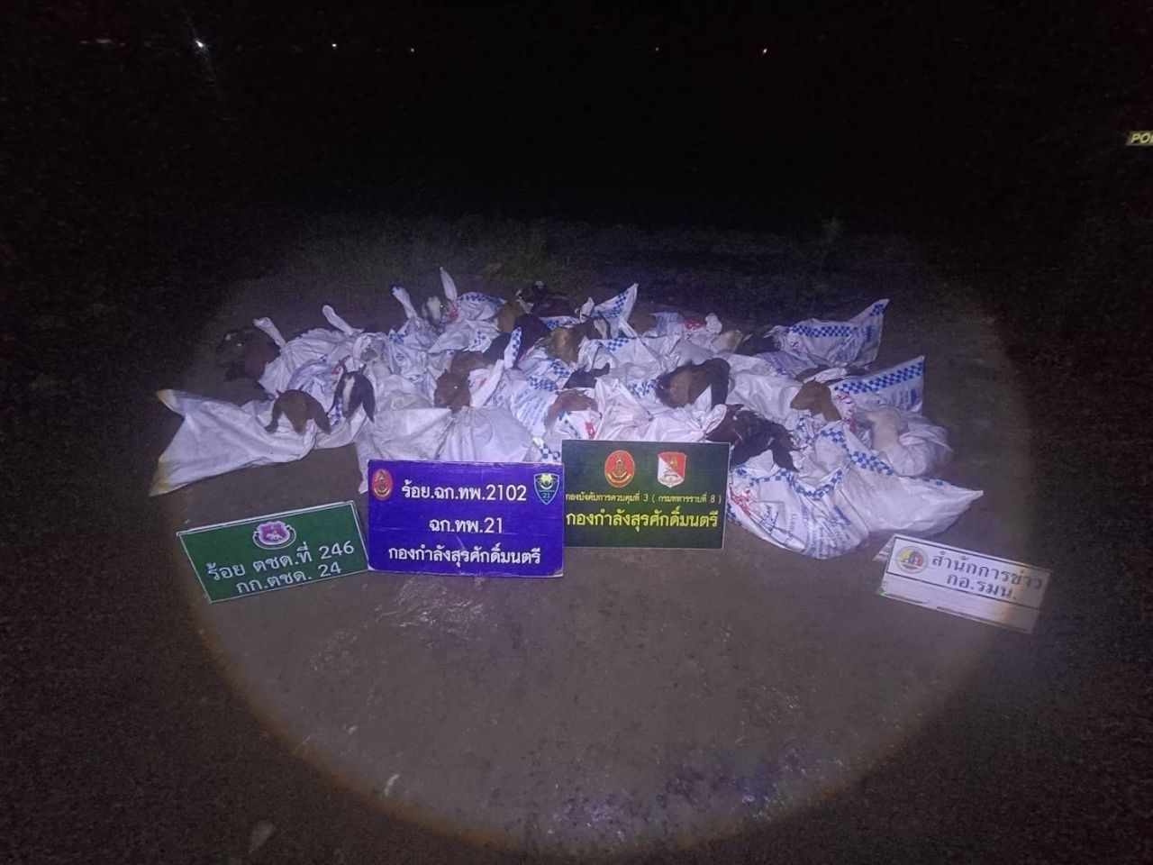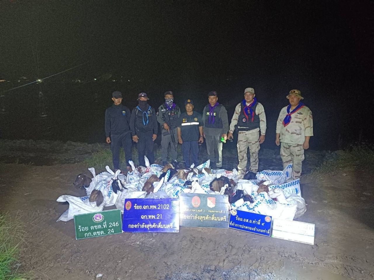 เจ้าหน้าที่ได้ควบคุมพื้นที่ และตรวจสอบบริเวณโดยรอบ พบแพะอยู่ในกระสอบปุ๋ย 30 กระสอบ รวมแพะ 30 ตัว ประสานไปยังศุลกากร อ.ท่าลี่ ฝ่ายปกครอง อ.ท่าลี่ ตชด.2463 ร่วมตรวจยึด และนำของกลางมายัง กองร้อย ฉก.ทพ.2102 เพื่อตรวจนับอย่างละเอียด บันทึกภาพถ่าย และบันทึกวิดีโอไว้เป็นหลักฐาน เพื่อนำของกลางส่ง ศุลกากรท่าลี่ ดำเนินการตามกฎหมายต่อไป.