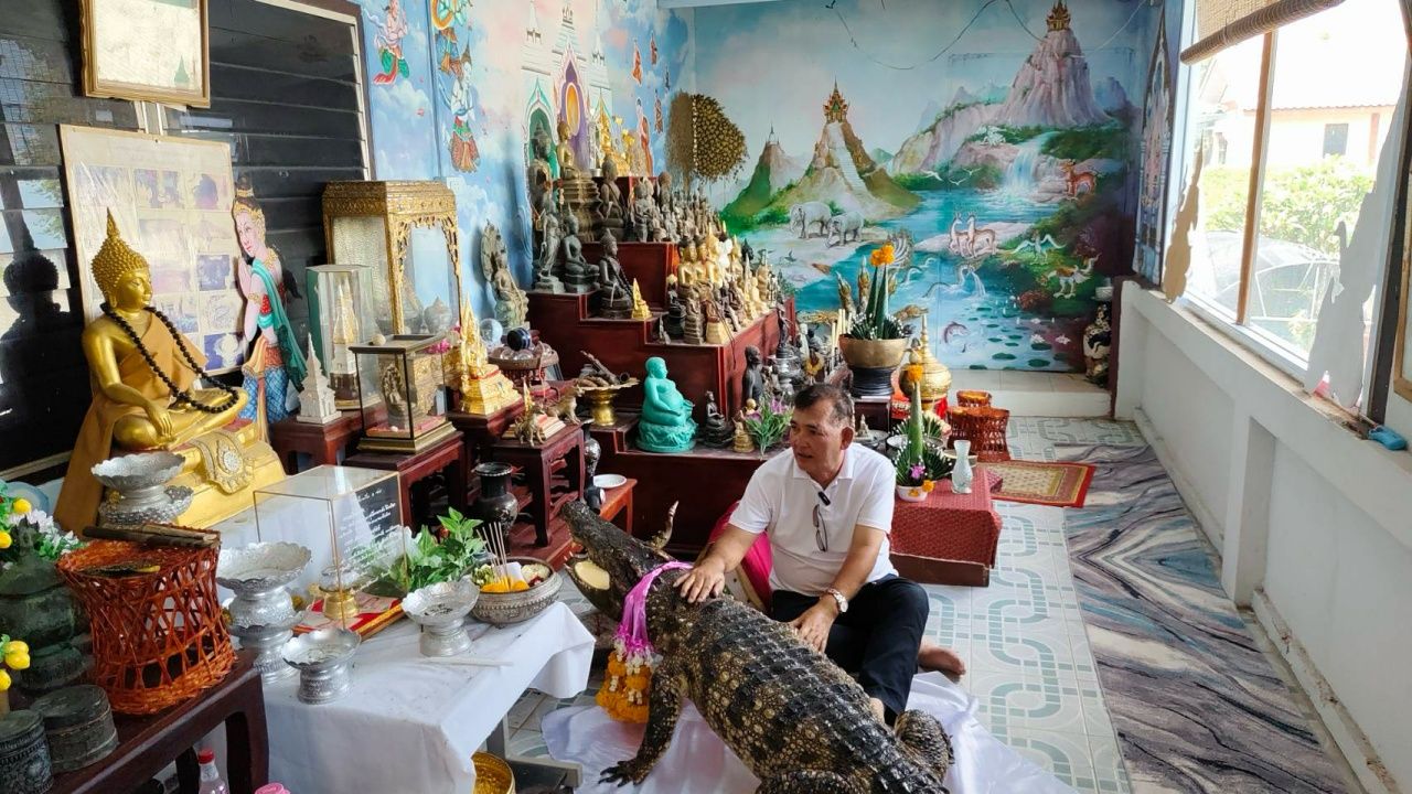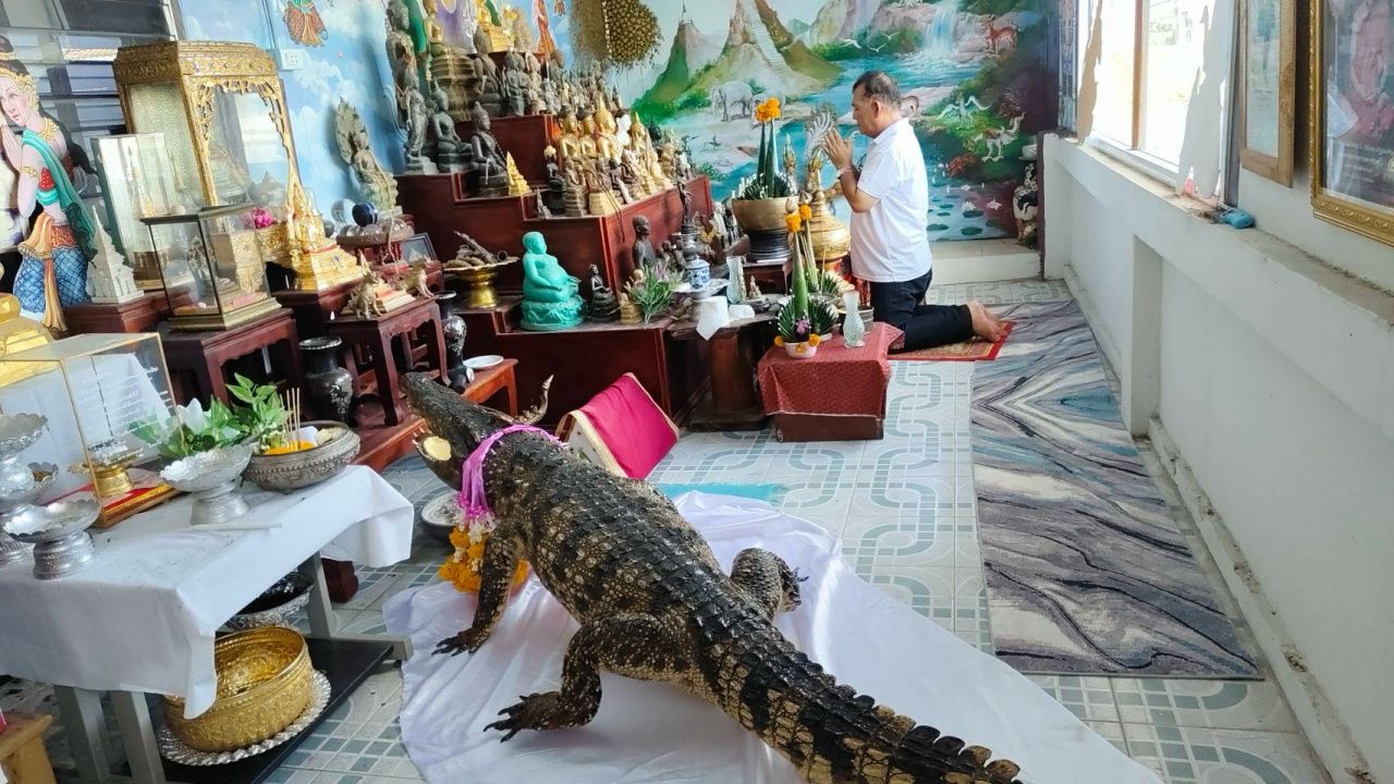 ครอบครัว สท.แดง พันปี นำร่างสต๊าฟ "ไอ้ทอง" จระเข้แสนรู้ จากศูนย์วิจัยประมงน้ำจืดจังหวัดนครสวรรค์ มาเก็บไว้บนห้องพระชั้น 2 ของบ้าน เตรียมทำบุญเลี้ยงเพลพระ และจัดพิธีเบิกเนตร ชาวบ้านส่องขนาด ได้เลขเด็ดเสี่ยงโชค