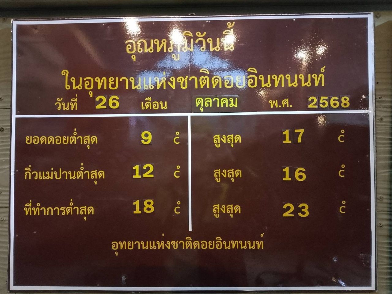 สำหรับสภาพอากาศบนยอดดอยอินทนนท์นั้น วันนี้ต่ำสุดวัดได้ 9 องศาฯ ทำให้เกิดปรากฏการณ์น้ำค้างบนยอดหญ้า สร้างความตื่นตาตื่นใจให้นักท่องเที่ยวที่ขึ้นไปสัมผัสอากาศหนาวกันเป็นอย่างมาก