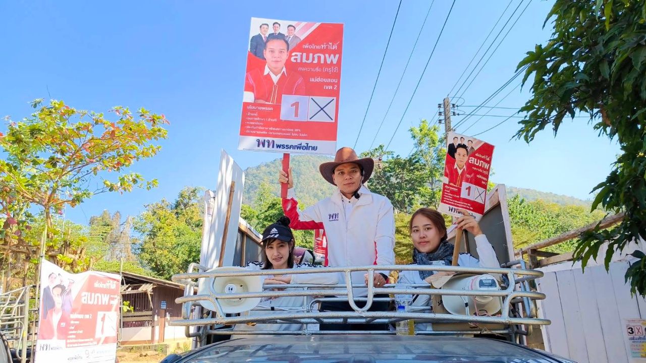 "ครูโจ้" ผู้สมัคร สส.พรรคเพื่อไทย เขต 2 จ.แม่ฮ่องสอน ขึ้นเขาลงห้วย บุกป่าฝ่าดงหาเสียงขอคะแนนชาวบ้าน โดยชูจุดขายนโยบายพรรคฯ รวมทั้งความเป็นคนชาติพันธุ์รักและเข้าใจพื้นที่