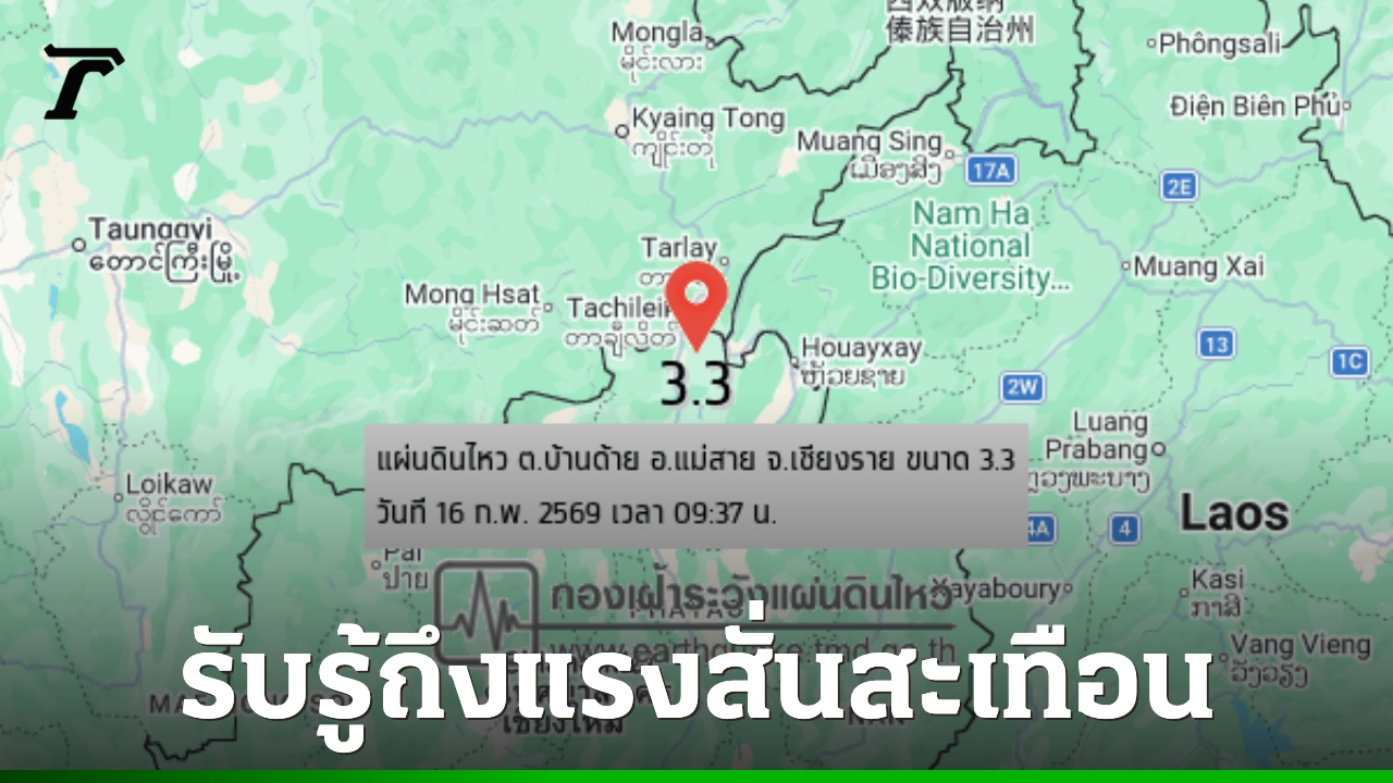 วันที่ 16 ก.พ. 69 เว็บไซต์ กองเฝ้าระวังแผ่นดินไหว กรมอุตุนิยมวิทยา ตรวจพบแผ่นดินไหว เมื่อเวลา 09.37 น. ที่บริเวณ ต.บ้านด้าย อ.แม่สาย จ.เชียงราย (20.304°N, 99.957°E) ขนาด 3.3 ลึก 3 กม.