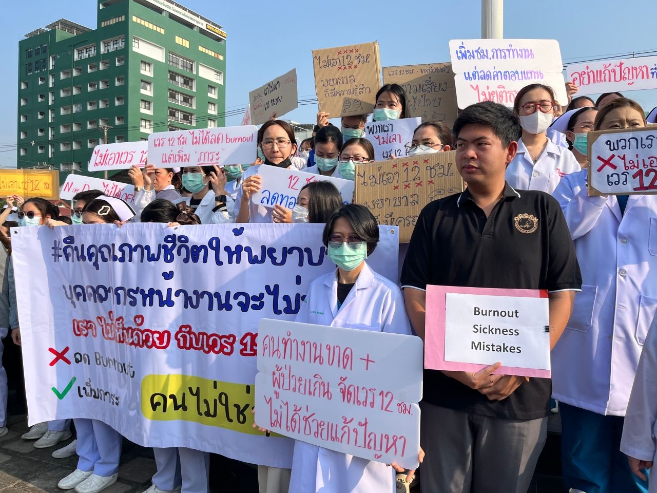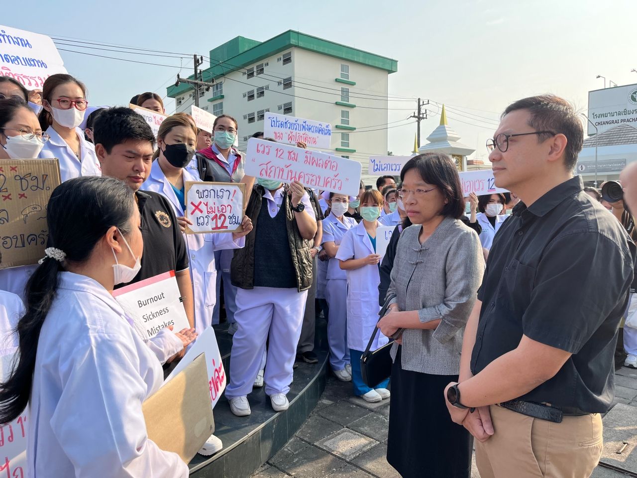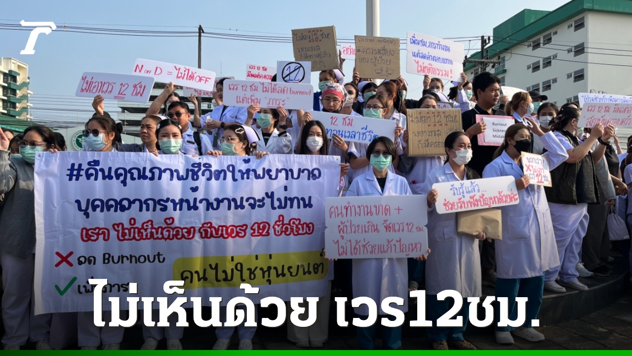พยาบาล โรงพยาบาลเชียงรายประชานุเคราะห์ ถือป้ายต้านเกณฑ์ทำงานใหม่ ไม่เกิน 12 ชม. จี้ผู้บริหารทบทวน ชี้ขาดอัตรากำลัง-แก้ไม่ตรงจุด อาจทำให้เหนื่อยมากกว่าเดิม
