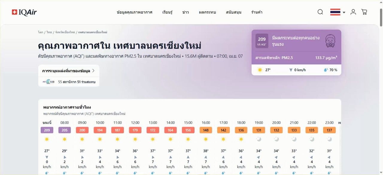 คนเชียงใหม่อ่วม เช้านี้ค่าฝุ่น PM 2.5 กลับมาขึ้นอันดับ 1 เมืองอากาศแย่ที่สุดของโลก ส่งผลให้ 25 อำเภอเป็นสีแดง พบจุดความร้อนจำนวน 17 จุด