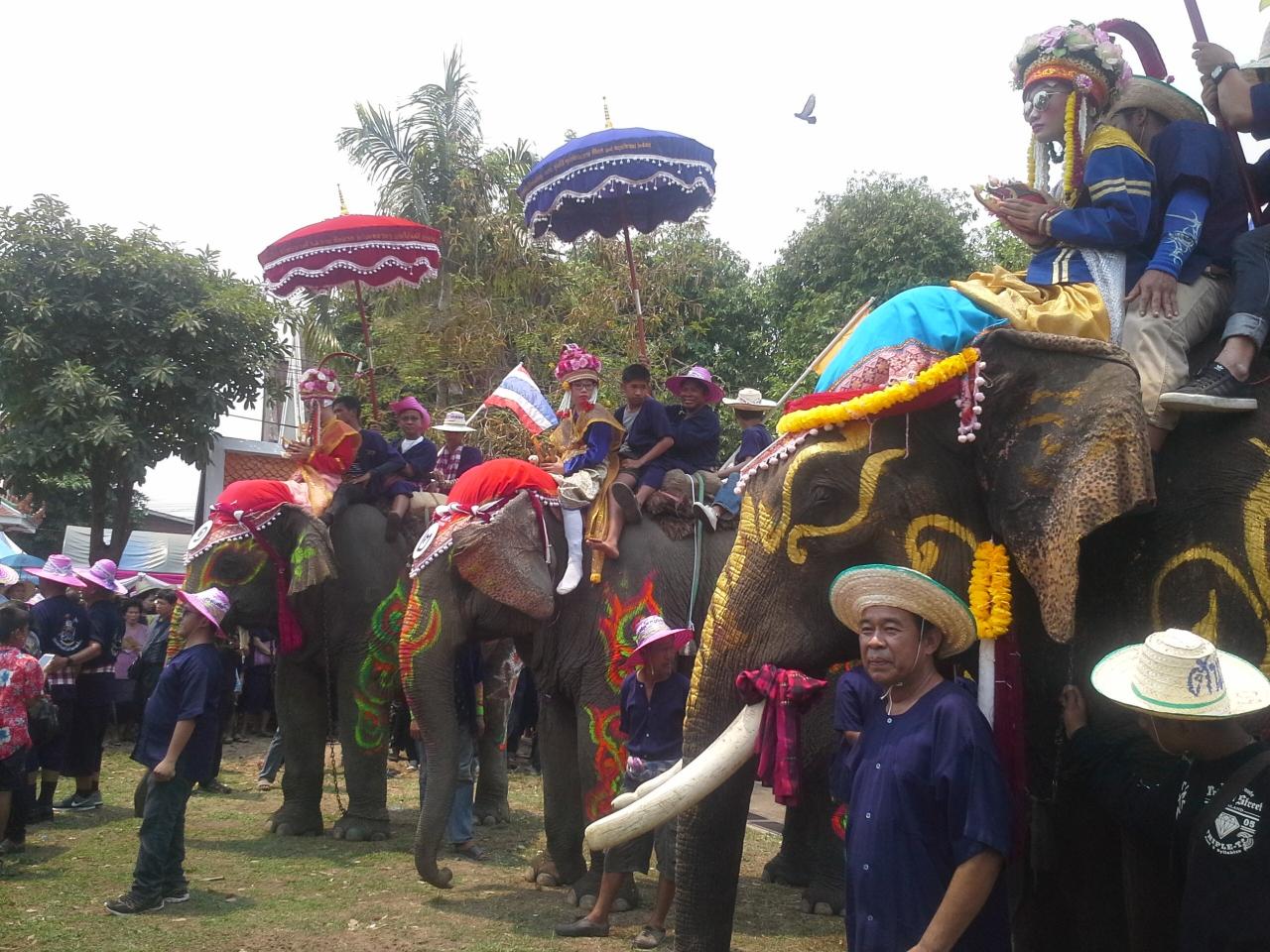 ขณะเดียวกัน หลังจากพิธีเปิดเสร็จสิ้นขบวนแห่นาคด้วยช้าง ได้เริ่มแห่ออกจากวัดไปรอบๆ ชุมชนระยะทางกว่า 8 กิโลเมตร แต่ละขบวนจะมีแตรวงบรรเลงสร้างความสนุกสนานให้กับญาติของนาคผู้บวชตลอดเส้นทางโดยมีชาวบ้านสองข้างทาง นำผลไม้หลากชนิดและน้ำดื่ม มาคอยเลี้ยงช้าง และเล่นสาดน้ำใส่ช้าง ผู้ร่วมขบวนตลอดเส้นทาง
