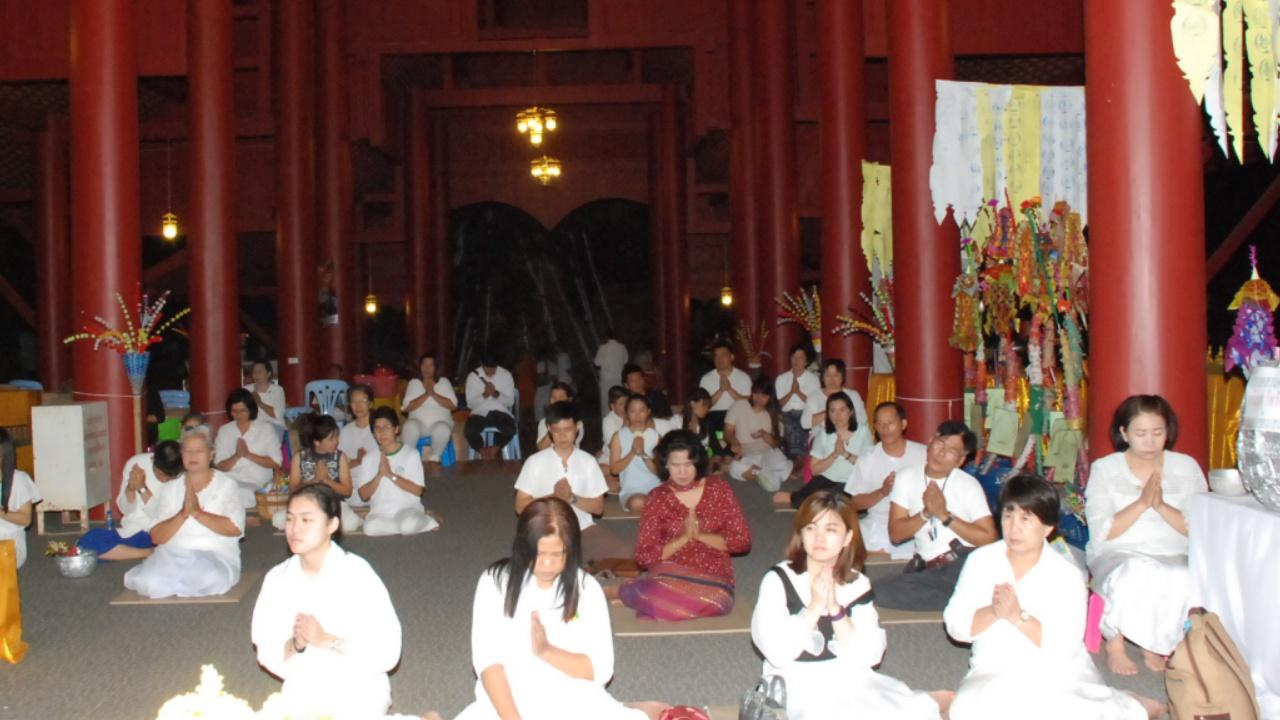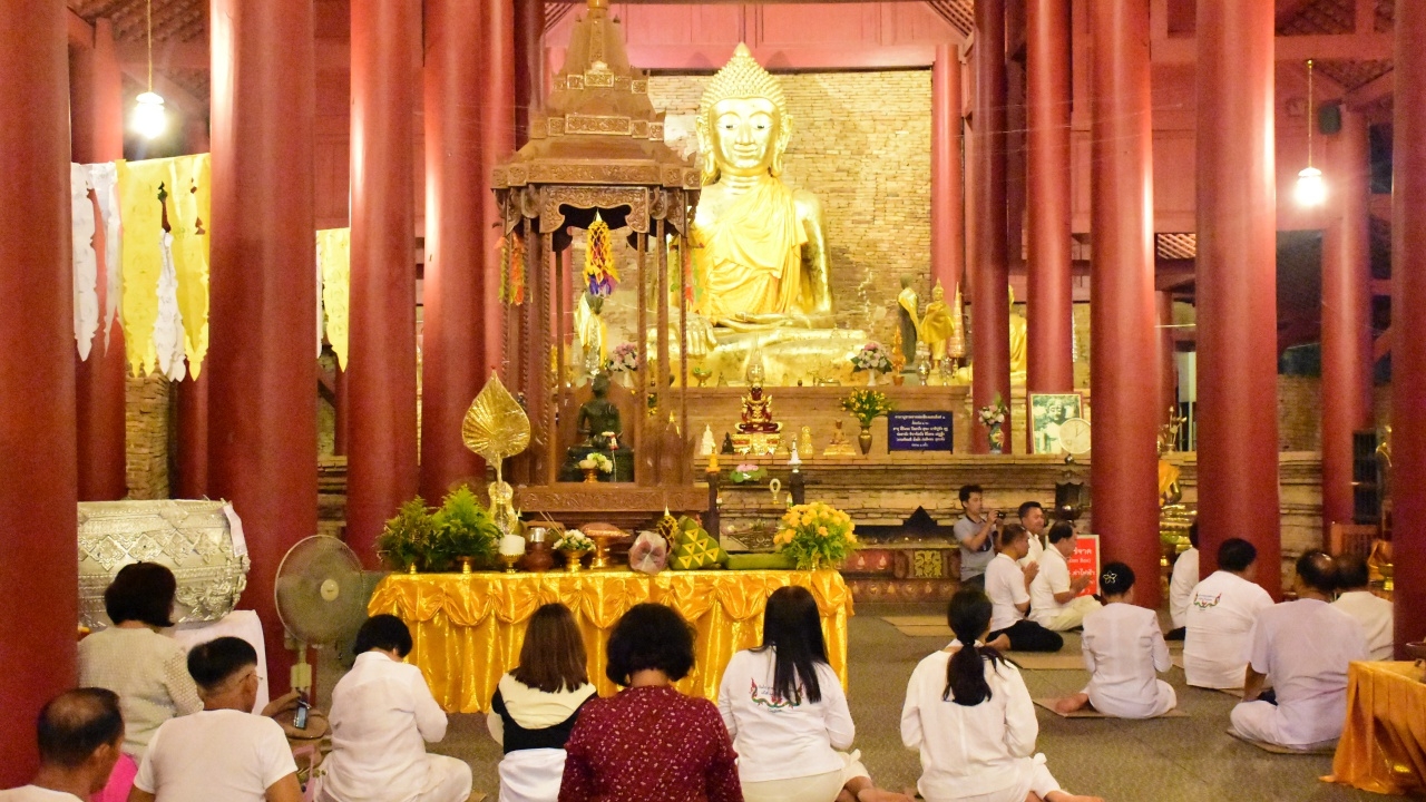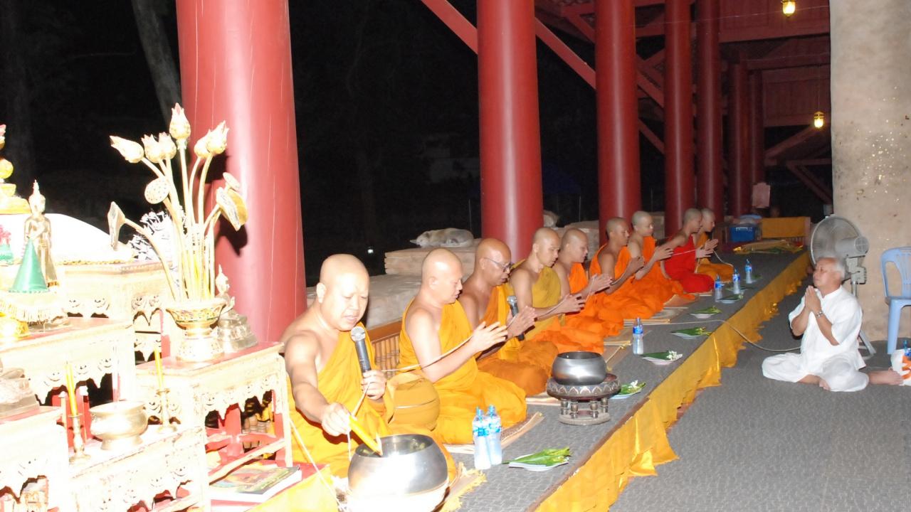 พระพุทธิญาณมุนี เจ้าคณะอำเภอเชียงแสนนำพระสงฆ์ใน ต.เวียง 65 รูป ประกอบพิธีสวดชัยมงคลรับพระอุปคุต วันเป็งปุ๊ด เวลาเที่ยงคืน ปชช. ขณะที่รอตั้งแถวใส่บาตร เชื่อเสริมสิริมงคล ขอพรอันใดสำเร็จได้ง่ายกว่าการอธิษฐานปกติ