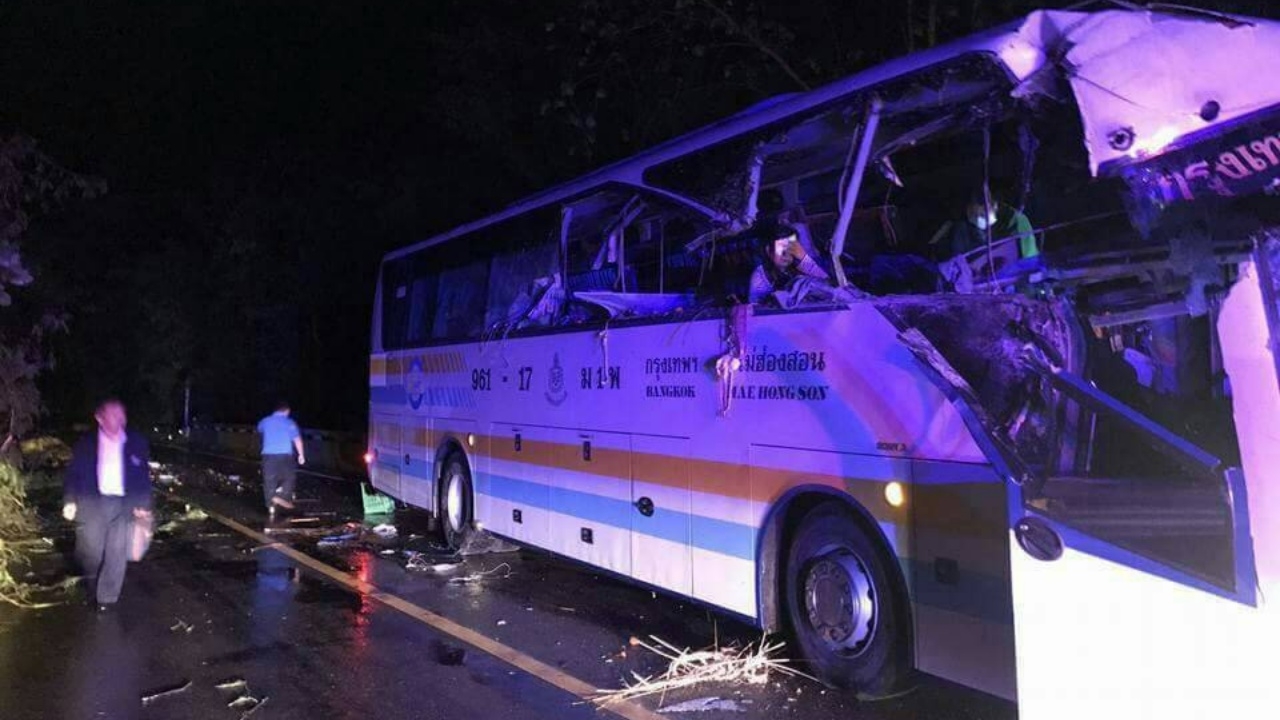 พายุฝนที่ อ.ฮอด จ.เชียงใหม่ ทำกิ่งไม้หักขวางถนน รถบรรทุกสิบล้อวิ่งลงเขา เบรกแล้วเอาไม่อยู่ ไถลข้ามเลนไปเกี่ยวเอาฝั่งขวาของรถทัวร์สายกรุงเทพฯ-แม่ฮ่องสอน เป็นแผลเหวอะ ผู้โดยสารบาดเจ็บ 9 สาหัส 3...