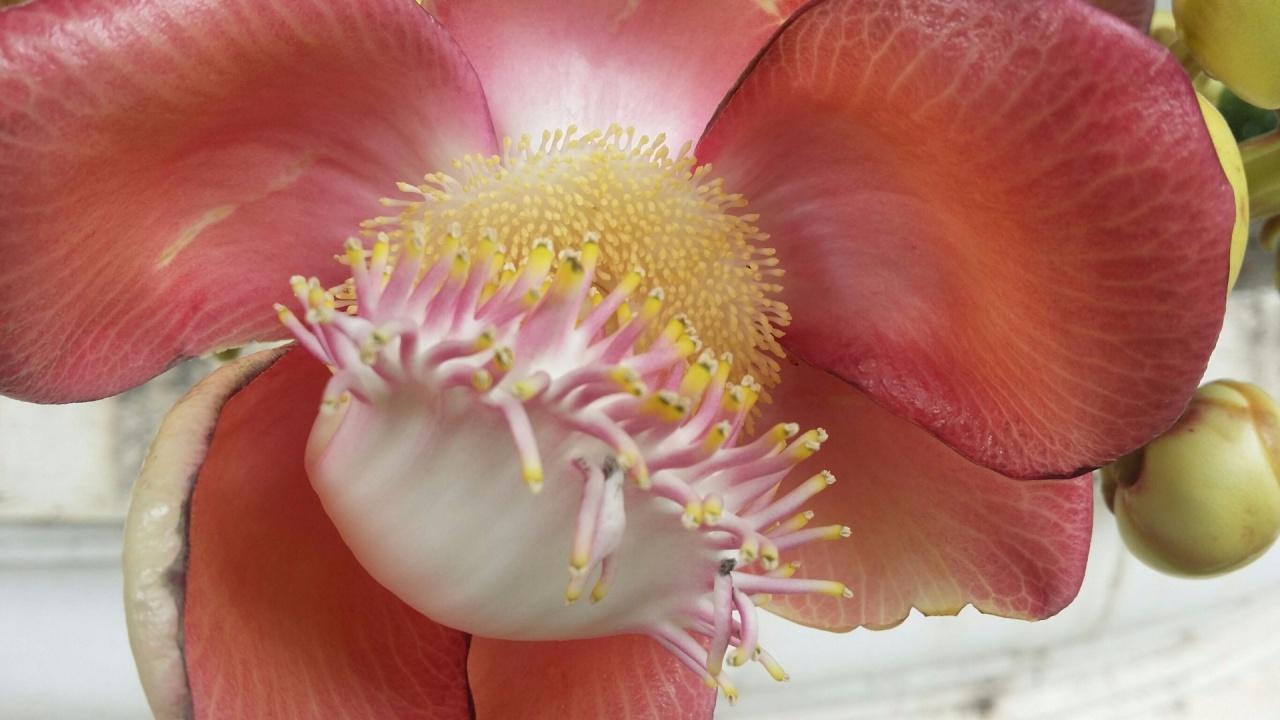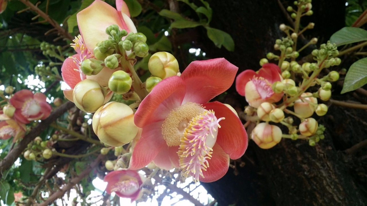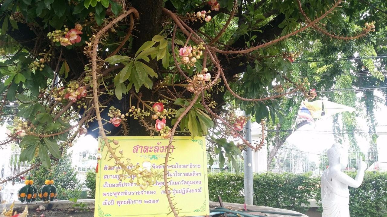 สำหรับต้นสาละลังกา หรือ ต้นลูกปืนใหญ่ (Cannonball Tree) มีถิ่นกำเนิดมาจากประเทศ Guiana และประเทศอื่นๆ ในแถบทวีปอเมริกาใต้ โดยเฉพาะที่ราบลุ่มแม่น้ำอเมซอน นิยมปลูกเป็นไม้ประดับทั่วไปในประเทศเขตร้อน เป็นพันธุ์ไม้นำมาจากประเทศคิวบา ประเทศไทยปลูกเมื่อปี พ.ศ.2500 เป็นไม้ยืนต้นผลัดใบสูง 15-25 เมตร ดอกช่อใหญ่ ยาว ออกตามโคนต้น ดอกสีชมพูอมเหลืองและแดง กลิ่นหอม ชาวลังกาถือว่าเป็นต้นไม้มงคลในพระพุทธศาสนา ด้วยเห็นว่า ดอกมีลักษณะสวยและมีกลิ่นหอม จึงนำไปถวายพระ อีกทั้งนิยมปลูกภายในวัดมากกว่าตามอาคารบ้านเรือน.