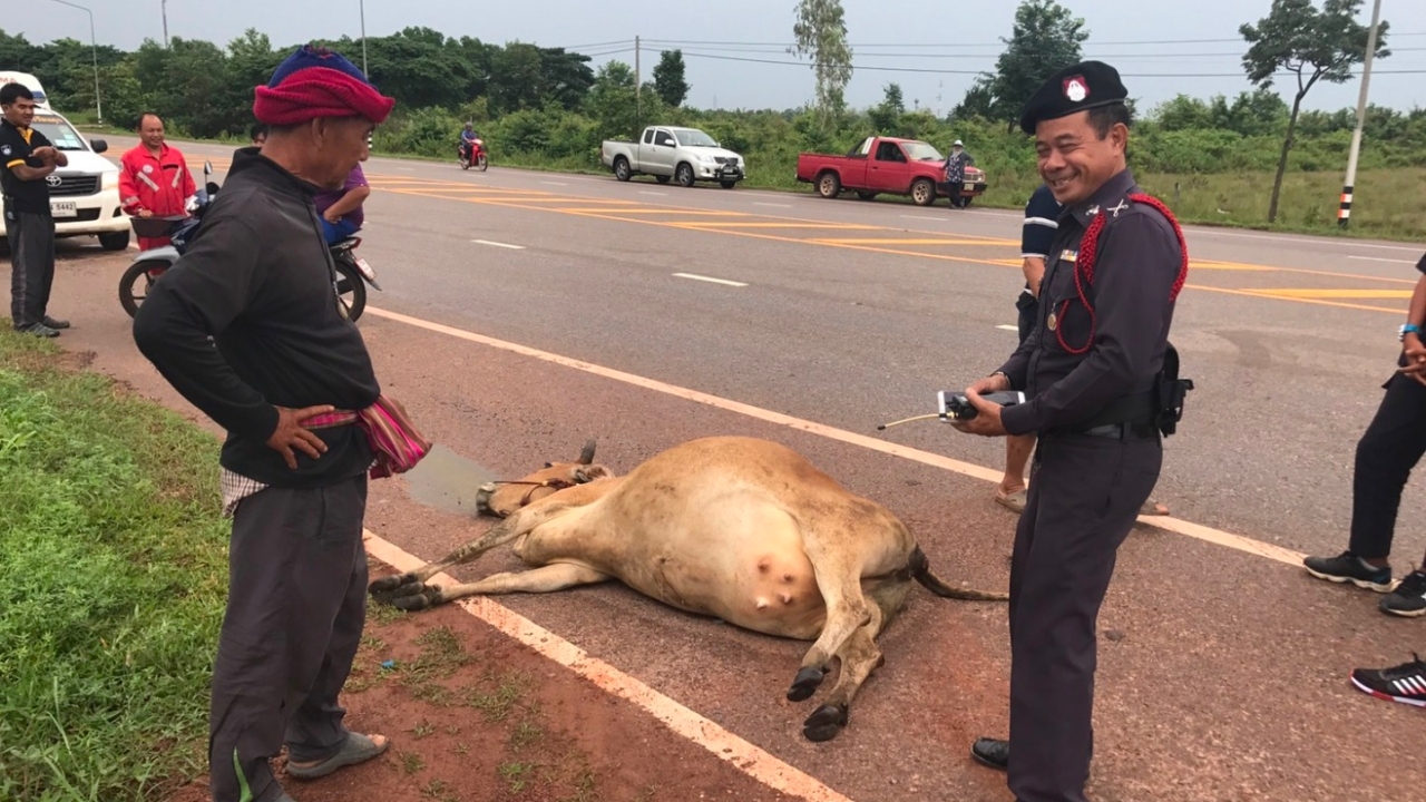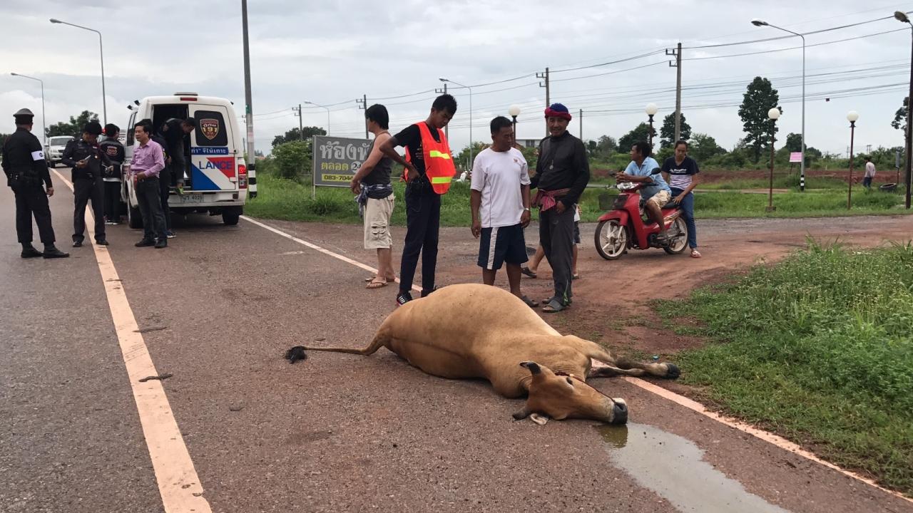 ทั้งนี้ พบรถยนต์เก๋งวอลโว่ 850 สีดำ ทะเบียน ฆจ 2340 กทม. สภาพด้านหน้ารถพังเสียหาย มีนายสมชาย พูนภัสสร อายุ 66 ปี เป็นคนขับ ยืนรอให้การกับตำรวจอยู่ ห่างออกไปเล็กน้อยพบวัวเพศเมียที่กำลังท้องแก่ อายุประมาณ 4 ปี นอนตายอยู่ข้างถนน