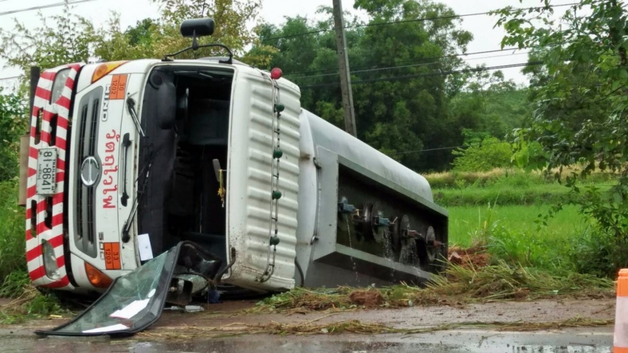 รถบรรทุกน้ำมัน 12,000 ลิตร เสียหลักพลิกคว่ำที่ จ.กาฬสินธุ์ พบน้ำมันไหลออกมาตลอดเวลา ด้านเจ้าหน้าที่เร่งนำถังมารอง หวั่นเกิดอันตราย