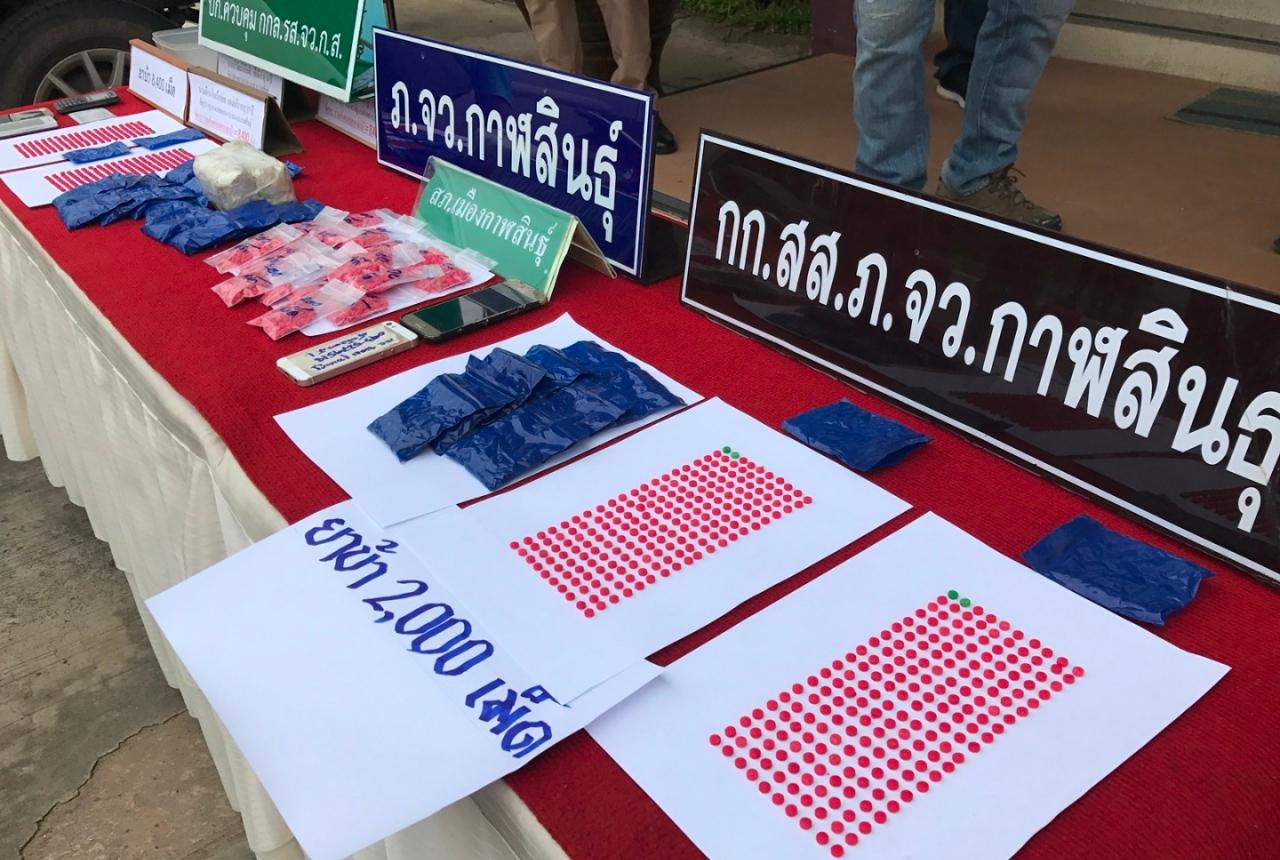 และรายสุดท้าย เจ้าหน้าที่ตำรวจทำการจับกุมตัว นายสุรชัย หรือ เชียง ชาสงวน อายุ 39 ปี และ นายธนวัฒน์ หรือ หนุ่ย หัดรัดชัย อาย 37 ปี พร้อมของกลางยาบ้า จำนวน 2,000 เม็ด และยึดรถจักรยานยนต์ยี่ห้อฮอนด้า สกู๊ปปี้ไอ สีแดง-เทา หมายเลขทะเบียน 1กจ 4818 พระนครศรีอยุธยา และรถจักรยานยนต์ฮอนด้า สกู๊ปปี้ไอ สีน้ำตาล หมายเลขทะเบียน กษบ 275 กาฬสินธุ์ ขณะที่ได้รับรายงานจากสายข่าวว่าทั้งสองจะขับรถจักรยานยนต์มาจอดที่หลักกิโลเมตรที่ 21 ถนนสายกาฬสินธุ์-สมเด็จ ต.นาจารย์ อ.เมือง จ.กาฬสินธุ์ หลังจากนั้นได้ขับรถมุ่งหน้าเข้าตัวเมืองกาฬสินธุ์ ชุดจับกุมจึงได้ขับรถตาม และนำรถยนต์เข้าทำการจับกุมตัวได้ โดยผู้ต้องหาสารภาพได้ถูกว่าจ้างจากชายฝั่ง สปป.ลาว ให้นำยาบ้ามาส่งให้กับเครือข่าย ได้รับค่าจ้าง จำนวน 30,000 บาท แต่ก็มาถูกเจ้าหน้าที่จับกุมเสียก่อน โดยเจ้าหน้าที่ทำการนำตัวผู้ต้องหา พร้อมของกลางทั้งหมดส่งพนักงานสอบสวน พร้อมแจ้งข้อกล่าวหาว่ามียาเสพติดให้โทษประเภท 1 ยาบ้าไว้ในครอบครอง เพื่อจำหน่ายโดยผิดกฎหมาย.
