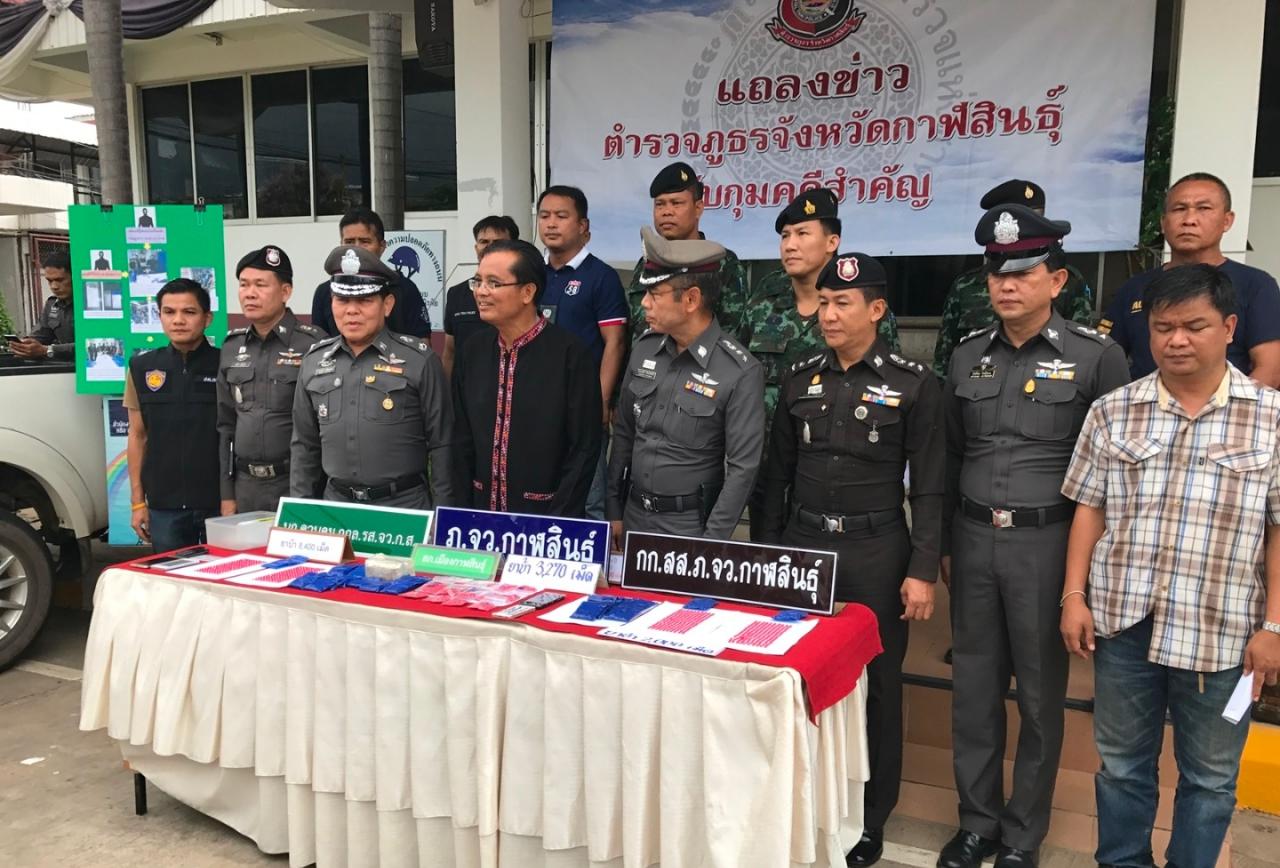 เมื่อเวลา 09.00 น. วันที่ 23 ก.ค. 60 ที่ บก.ภ.จ.กาฬสินธุ์ นายสุวิทย์ คำดี ผวจ.กาฬสินธุ์ พล.ต.ต.มนตรี จรัลพงศ์ ผบก.ภ.จ.กาฬสินธุ์ พ.อ.ประวัติ จารุตัน เสธ.กกล.รส.จ.กาฬสินธุ์ พร้อมเจ้าหน้าที่ตำรวจชุดจับกุม ทหาร ฝ่ายปกครอง ร่วมกันแถลงข่าวการจับกุมเครือข่ายจำหน่ายยาบ้าในพื้นที่จังหวัดกาฬสินธุ์ โดยดำเนินคดี 3 คดี ผู้ต้องหา 7 ราย พร้อมของกลางยาบ้า จำนวน 13,670 เม็ด และตรวจยึดรถยนต์และรถจักรยานยนต์