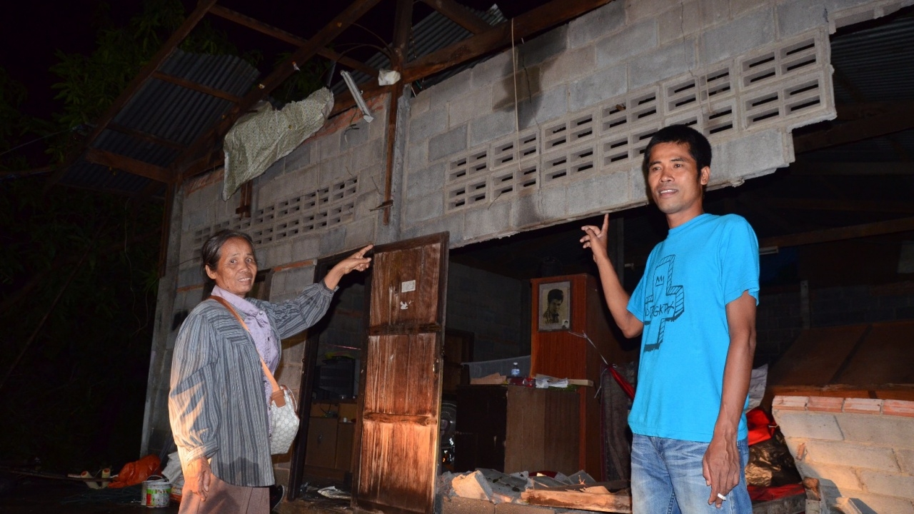 สอบถามนางเสวียน เล่าว่า เวลาประมาณ 18.00 น.(26 ก.ค.60) ขณะที่ตนเองกับลูกหลาน รวม 7 ชีวิต นอนดูทีวีอยู่ภายในบ้านได้มีลมพายุและฝนตกพัดมาอย่างแรงเสียงดัง จากนั้นก็พัดต้นแต้ ต้นไม้มี่อยู่ด้านหน้าบ้านล้มทับหลังคาและผนังบ้านได้รับความเสียหายทั้งหลัง ที่นอนและของใช้ทั้งหมดได้รับความเสียหายยังไม่รู้จะไปนอนที่ไหน แต่ยังโชคดีไม่มีใครในครอบครัวที่ได้รับอันตรายแต่อย่างใด