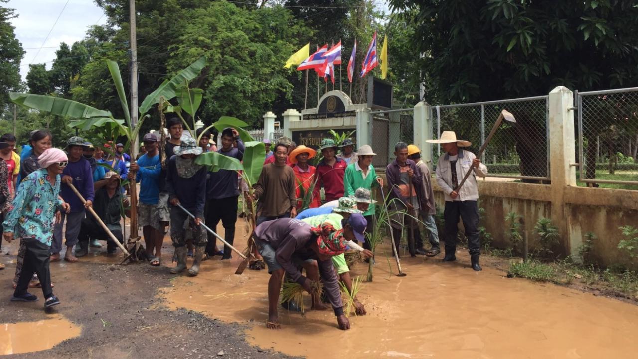 เมื่อเวลา 14.00 น. วันที่ 31 ก.ค.60 ที่ถนนในหมู่บ้านหนองเชียงทูน หมู่ 5 ตำบลหนองเชียงทูน อำเภอปรางค์กู่ จังหวัดศรีสะเกษ ซึ่งเป็นถนนเชื่อมระหว่างบ้านหนองเชียงทูน ตำบลหนองเชียงทูนกับบ้านกระต่ายด่อน ตำบลสมอ อำเภอปรางค์กู่ ซึ่งมีสภาพขรุขระเป็นหลุมบ่อ หน้าฝนมีน้ำขัง มีชาวบ้านประมาณ 40 คน ได้มาชุมนุมกันพร้อมกับนำต้นกล้วย ต้นตะไคร้ ต้นข้าว พร้อมกับนำแหมาทอดกลางถนน เพื่อเป็นการประชดที่ถนนผุพังเป็นหลุมเป็นบ่อน้ำท่วมขัง รถวิ่งไม่สะดวกตลอดปี ซึ่งเป็นมาหลายปี