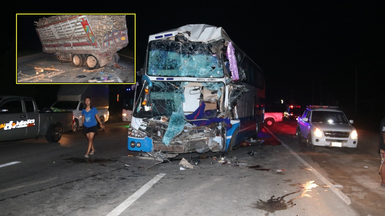 เกิดเหตุรถทัวร์ปรับอากาศชนท้ายพ่วงบรรทุกไม้ บนถนนมิตรภาพช่วงหลักกิโลเมตรที่ 70-71 ขาเข้า กทม. ระหว่างรถพ่วงจอดเคลียร์แท็กซี่คู่กรณีที่ถูกชนไปก่อนหน้า อ้างมองไม่เห็นสัญญาณไฟ ส่งผลเด็กบริการบนรถถูกอัดก๊อบปี้ตายคาที่