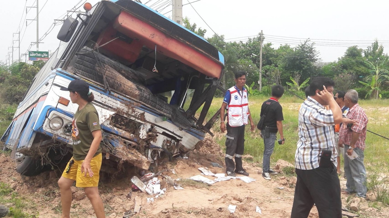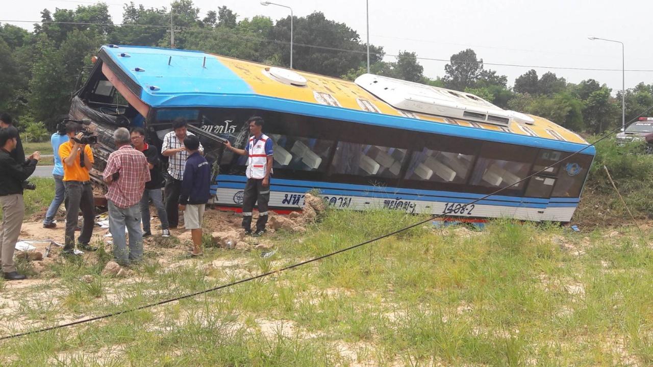 รถบัสโดยสาร สายมหาสารคาม–พยัคฆภูมิพิสัย ยางหน้าระเบิด พุ่งลงข้างทาง หัวรถด้านหน้าปักดิน ผู้โดยสารบาดเจ็บหลายราย