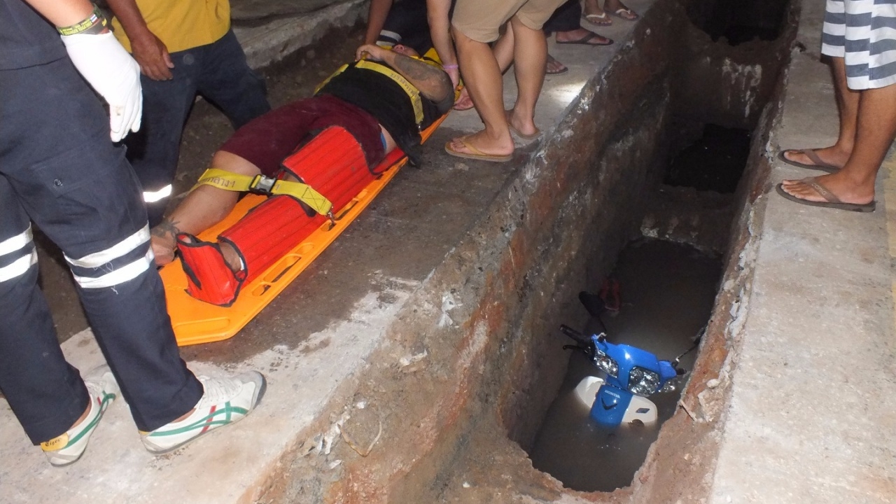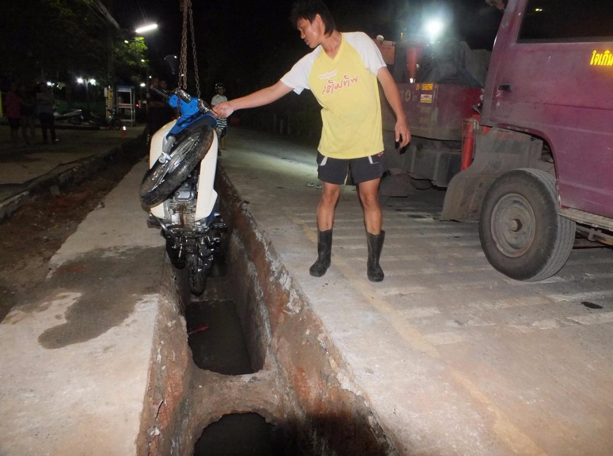 สาวทอมที่พิมาย ไปสังสรรค์กับเพื่อนกลับบ้านตีหนึ่ง ซิ่งมอเตอร์ไซค์มาด้วยความเร็วเจอหลุมที่การไฟฟ้าขุดไว้ เพื่อซ่อมเคเบิลใต้ดิน มีทั้งที่กั้นและไฟส่องสว่าง แต่หลบไม่ทัน ตกลงไปทั้งคนทั้งรถ ขาหัก บาดเจ็บสาหัส...