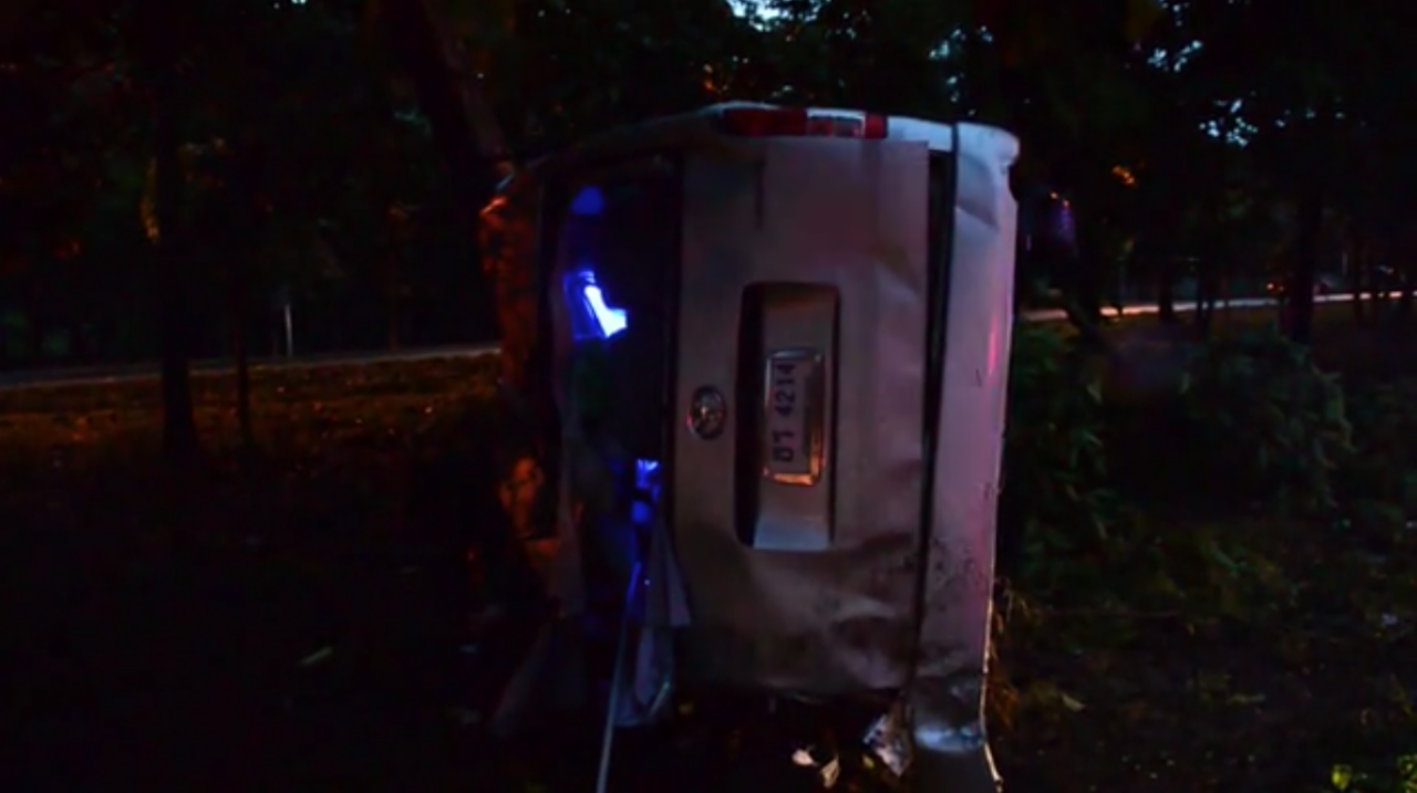 มีผู้ได้รับบาดเจ็บหลายราย รุดตรวจสอบพร้อมหน่วยกู้ภัย ที่เกิดเหตุพบรถตู้โตโยต้า ทะเบียน ฮร 4214 กรุงเทพมหานคร พลิกตะแคงอัดต้นไม้อยู่ร่องกลางถนน มีผู้บาดเจ็บ 6 ราย เจ้าหน้าที่กู้ภัยลำเลียงส่งโรงพยาบาลสรรพสิทธิประสงค์