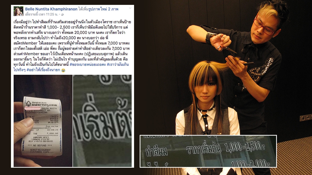 จากกรณีที่ เบลล์ นันทิตา ฆัมภิรานนท์ นักร้องดังจากรายการ ไทยแลนด์ก็อตทาเลนต์ โพสต์เฟซบุ๊กส่วนตัว ‘Belle Nuntita Khamphiranon’ ถึงเรื่องการทำสีผมที่ร้านเสริมสวยแห่งหนึ่งในตัวเมืองโคราช โดยจากป้ายติดหน้าร้าน ราคาทำสี 1,000-2,500 ซึ่งได้มีการเคลือบ ทำสี และทรีทเมนต์ให้ด้วย แต่หลังจากทำเสร็จ คิดเงินในราคา 20,000 บาท โดยทางร้านระบุว่า ได้สมัครเมมเบอร์ให้ เนื่องจากค่าทำสีผมครั้งนี้ 7,000 บาท ทั้งที่เป็นผมสั้นไม่ใช่ผมยาว แต่ทางนักร้องดังได้ขอจ่ายแค่ค่าทำสี ส่วนค่าเมมเบอร์ขอปฏิเสธการทำ