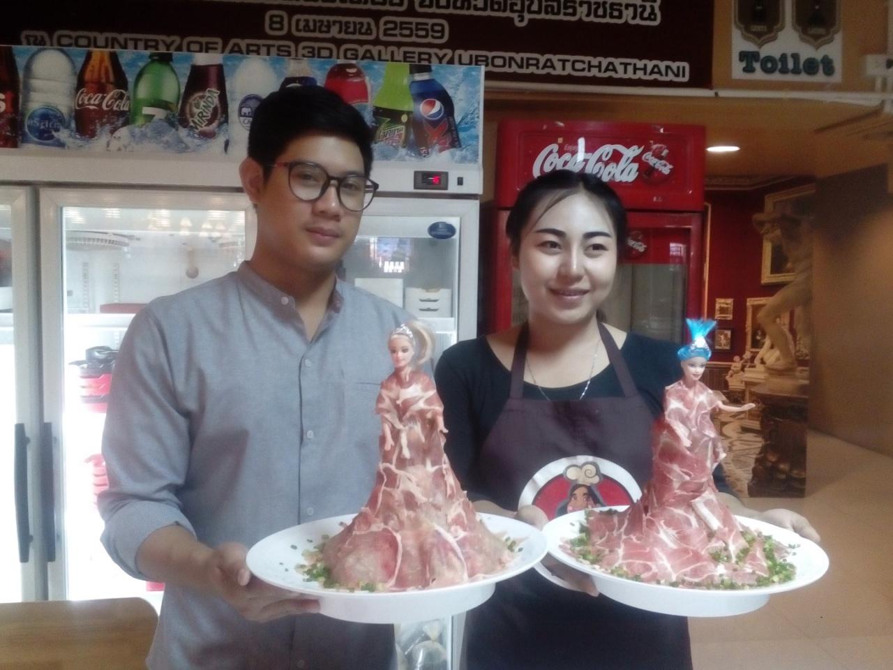 ผู้สื่อข่าวรายงานว่า ที่ ร้านชาบูยกซด อาคาร Country of Arts 3D Gallery ถนนเทพโยธี ทางเข้าสนามบินนานาชาติอุบลราชธานี ซึ่งเปิดเป็นร้านชาบูบุฟเฟ่ต์ มีการเสิร์ฟอาหารที่แปลกใหม่ ให้ลูกค้า โดยเมนูเนื้อสด ทางร้านได้บรรจง นำมาจัดแต่งเป็นชุดราตรี ห่มตัวตุ๊กตา ซึ่งลูกค้าก็ไม่พลาดที่จะเซลฟี่ลงโลกโซเชียล ส่งผลให้มีผู้ไปลิ้มลองเมนูชาบู และสัมผัสความแปลกนี้เป็นจำนวนมาก
