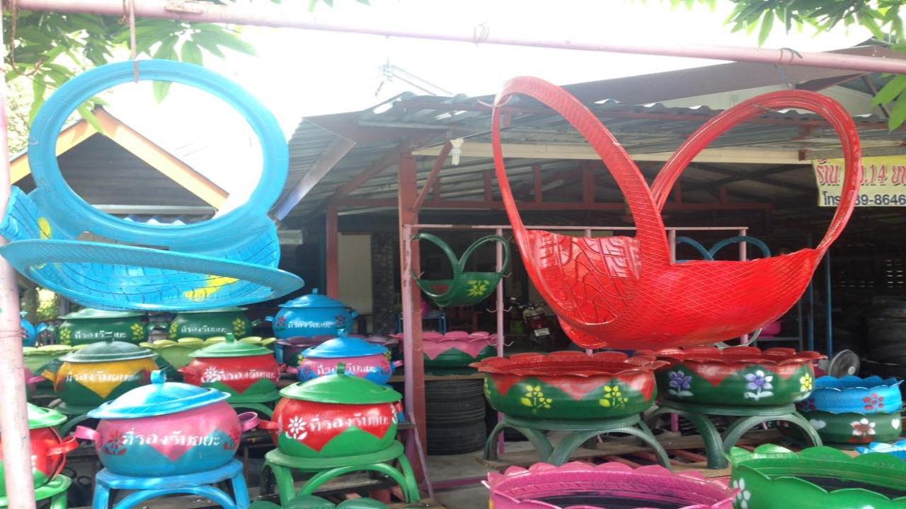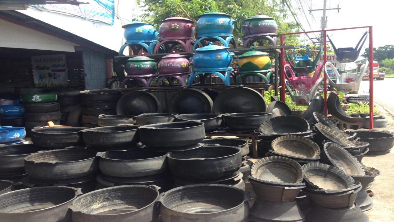 เมื่อเวลา 13.00 น. วันที่ 28 ก.ย. 60 ที่ กม.14 ยางเก่า ถนนชยางกูร กิโลเมตรที่ 14 ตำบลหัวเรือ อำเภอเมือง จังหวัดอุบลราชธานี มีคนวางขายสิ่งประดิษฐ์ที่ทำจาก ยางรถยนต์รีไซเคิล ทำเป็นถังขยะ บ่อเลี้ยงปลาหลากหลายสีสัน สวยงามสะดุดตา ทั้งหมดนี้ล้วนดัดแปลงมาจากยางรถยนต์เก่า ซึ่งเป็นแนวคิดของ นายพิณ เชื้อชัย อายุ 59 ปี และนางอาวรณ์ เชื้อชัย อายุ 53 ปี อยู่บ้านเลขที่ 152 หมู่ 9 บ้านค้อ ตำบลหัวเรือ อำเภอเมือง จังหวัดอุบลราชธานี สองสามีภรรยาเจ้าของร้าน กม.14 ยางเก่า ที่มีแนวคิดที่จะนำยางรถยนต์เก่าที่ไม่ได้ใช้งานและมีจำนวนมากมาดัดแปลง เป็นสิ่งของที่สามารถใช้งานได้ และทนทาน