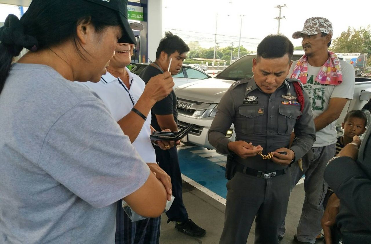 พบนายรังสรรค์ เกตุสิงห์น้อย อายุ 44 ปี อยู่บ้านเลขที่ 25/5 หมู่ 4 ต.ด่านแม่คำมัน อ.ลับแล จ.อุตรดิตถ์ พร้อมภรรยา ลูกชาย และพนักงานของปั๊ม ยืนถือกระเป๋าเป้สะพายขนาดเล็กสีดำ จึงร่วมกันเปิดกระเป๋าด้านในถุงผ้ากำมะหยี่สีแดง เมื่อเปิดออกดูก็ต้องตะลึง พบว่าเป็นสร้อยคอทองคำ 4 เส้น หนักเส้นละประมาณ 1-4 บาท สร้อยข้อมือทองคำ 3 เส้น หนักเส้นละ 2-4 บาท แหวนทองคำ 4 วง โดยนายรังสรรค์ พลเมืองดีแจ้งว่า เดินทางจากกรุงเทพมหานคร จะไป จ.ขอนแก่น แวะเข้าห้องสุขาของปั๊ม เห็นกระเป๋าเป้ใบดังกล่าววางอยู่บนถังน้ำชักโครก ไม่กล้าเปิดดูจึงถือออกมาแจ้งพนักงานของปั๊ม