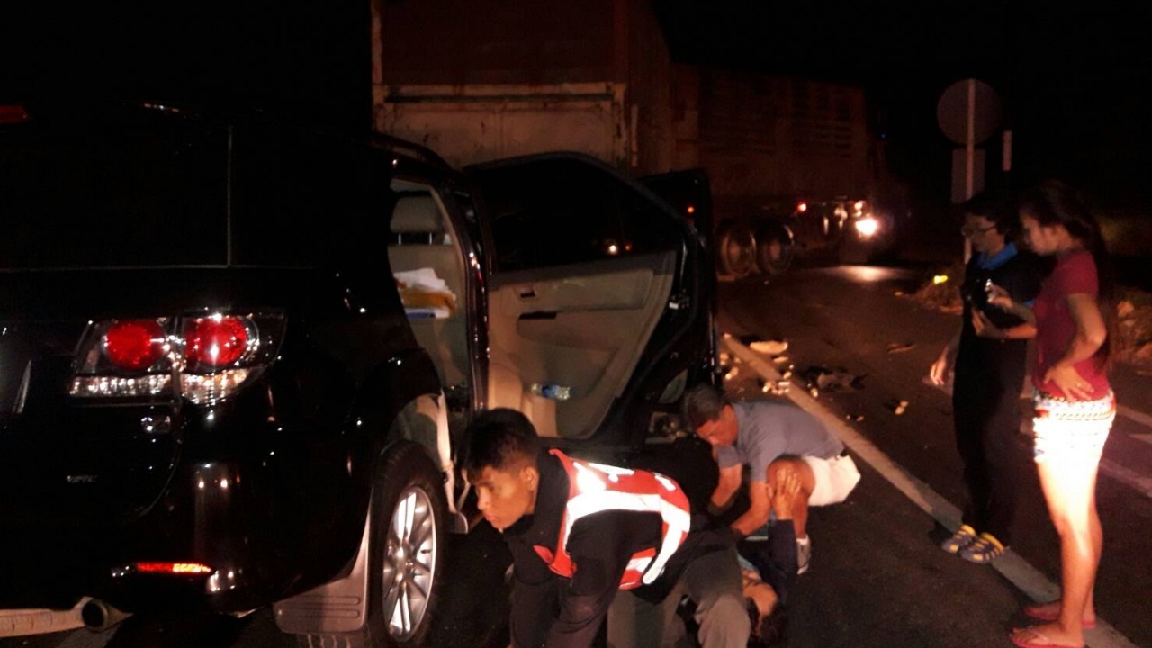 รถพ่วงกลับรถช่วงถนนมืด พ่วงหน้าข้ามฝั่งไปแล้ว แต่พ่วงหลังท้ายคาโด่อยู่บนถนนอีกฟาก กลุ่มนักธุรกิจนั่งฟอร์จูนเนอร์มาด้วยกัน 4 คน ชนเข้าอย่างจัง ตาย 2 สาหัส 2