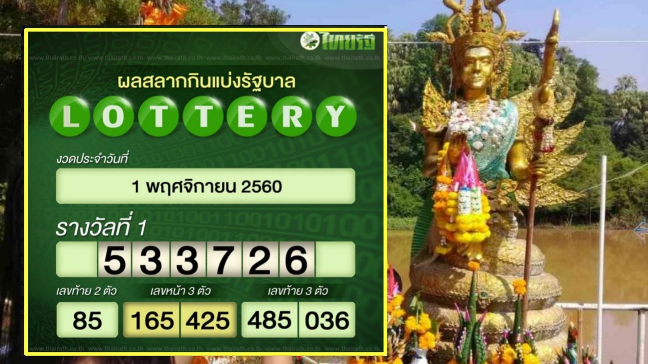 เวลา16.00น.วันที่ 1 พ.ย. ภายหลังการออกรางวัลสลากกินแบ่งรัฐบาล งวดวันที่1พ.ย.60โดยรรางวัลที่1 ออกเลข 533726 รางวัลเลขท้ายสองตัว 85