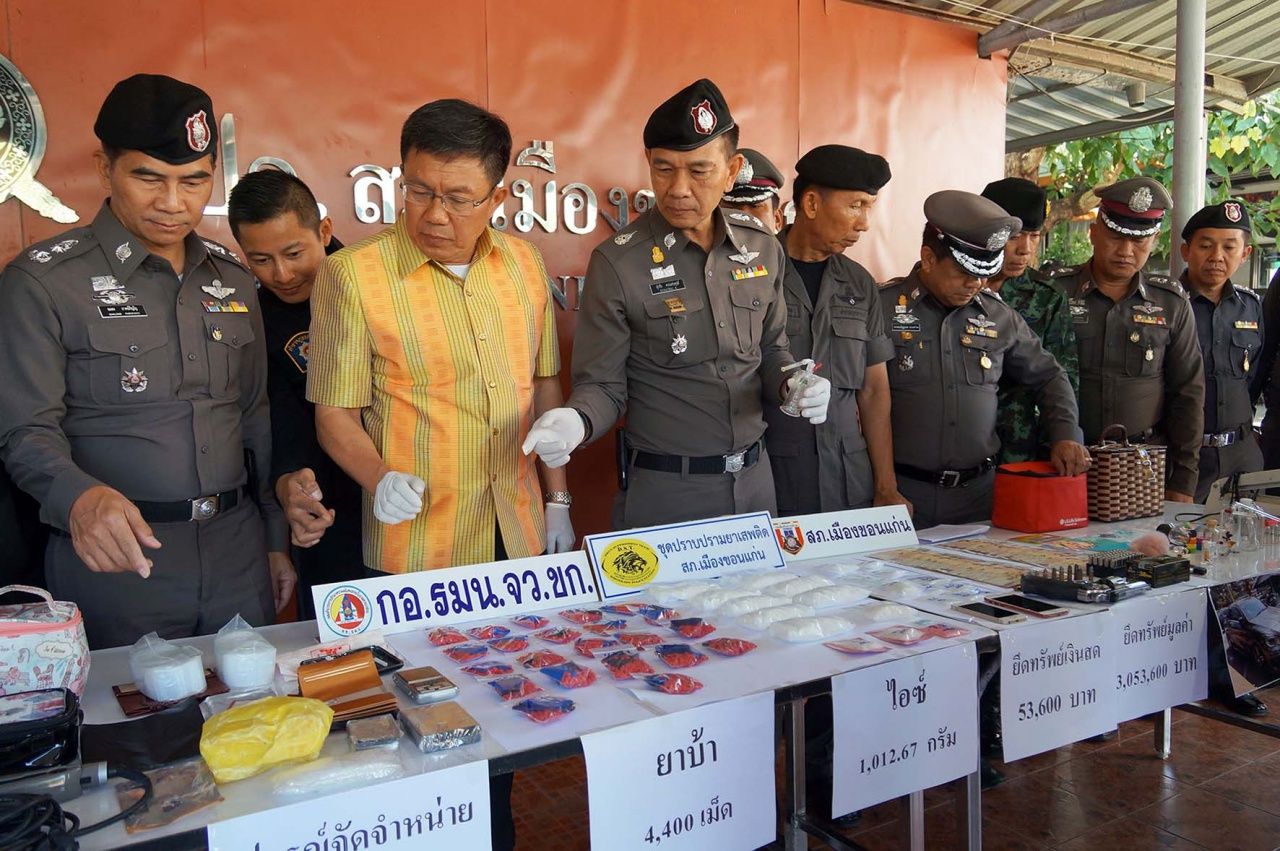 เมื่อเวลา 10.00 น.วันที่ 2 พ.ย.60 ที่สภ.เมืองขอนแก่น นายสมศักดิ์ จังตระกุล ผู้ว่าราชการจังหวัดขอนแก่น พล.ต.ต.สุรชัย ควรเดชะคุปต์ รักษาราชการแทนผู้บัญชาการตำรวจภูธรภาค 4 และเจ้าหน้าที่ทหาร ร่วมกันแถลงข่าวการจับกุม เจ๊หมู (ตำรวจขอสงวนชื่อ นามสกุล ที่อยู่) อายุ 40 ปี ชาว อ.เมืองขอนแก่น พร้อมของกลาง ยาไอซ์ 1,012.67 กรัม ยาบ้า 4,400 เม็ด ยาอี 4 เม็ด อาวุธปืนบีบีกันอัดแก๊ส ดัดแปลง ขนาด .38 จำนวน 1 กระบอก เครื่องกระสุนปืน ขนาด .38 จำนวน 61 นัด โทรศัพท์มือถือสมาร์ทโฟน 2 เครื่อง รถเก๋งยี่ห้อเบนซ์ รุ่น CLA 250 สีดำ หมายเลขทะเบียน 4กค 3289 กทม. เงินสดจำนวน 53,600 บาท พร้อมอุปกรณ์การเสพยาเสพติด อุปกรณ์ประกอบการจำหน่ายยาเสพติดอีกจำนวนมาก หลังทางเจ้าหน้าที่ตำรวจวางแผนเข้าจับกุมได้ที่หน้าอพาร์ตเมนต์ ป่ากลางเมือง ต.ในเมือง อ.เมือง จ.ขอนแก่น ขณะที่เจ๊หมู ขับรถเบนซ์นำยาเสพติดมาส่งให้ลูกค้า เมื่อเวลาประมาณเที่ยงคืนวันที่ 31 ต.ค.ที่ผ่านมา