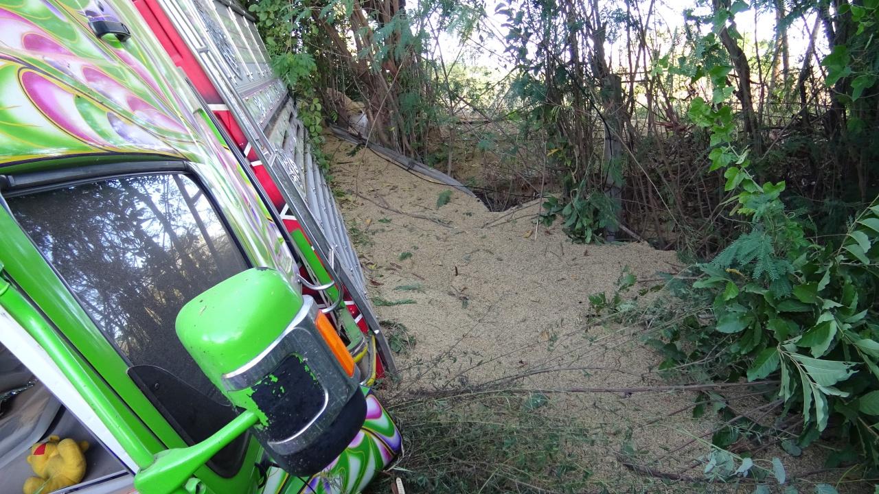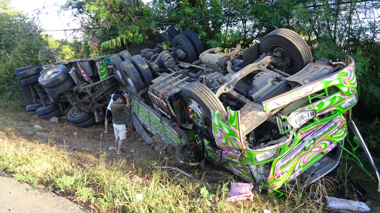 เกิดเหตุรถพ่วงบรรทุกข้าวเปลือกจากโรงสีในยโสธร ขณะแล่นไปส่งที่มหาสารคาม เกิดยางรถด้านหลังระเบิดพร้อมกัน 2 เส้น ส่งผลให้รถเสียการทรงตัว พุ่งชนเสาไฟฟ้าข้างทางจนหัก แล้วพลิกคว่ำลงข้างทาง ทำให้ข้าวเปลือกกว่า30ตัน เทกระจายเต็มพื้น...