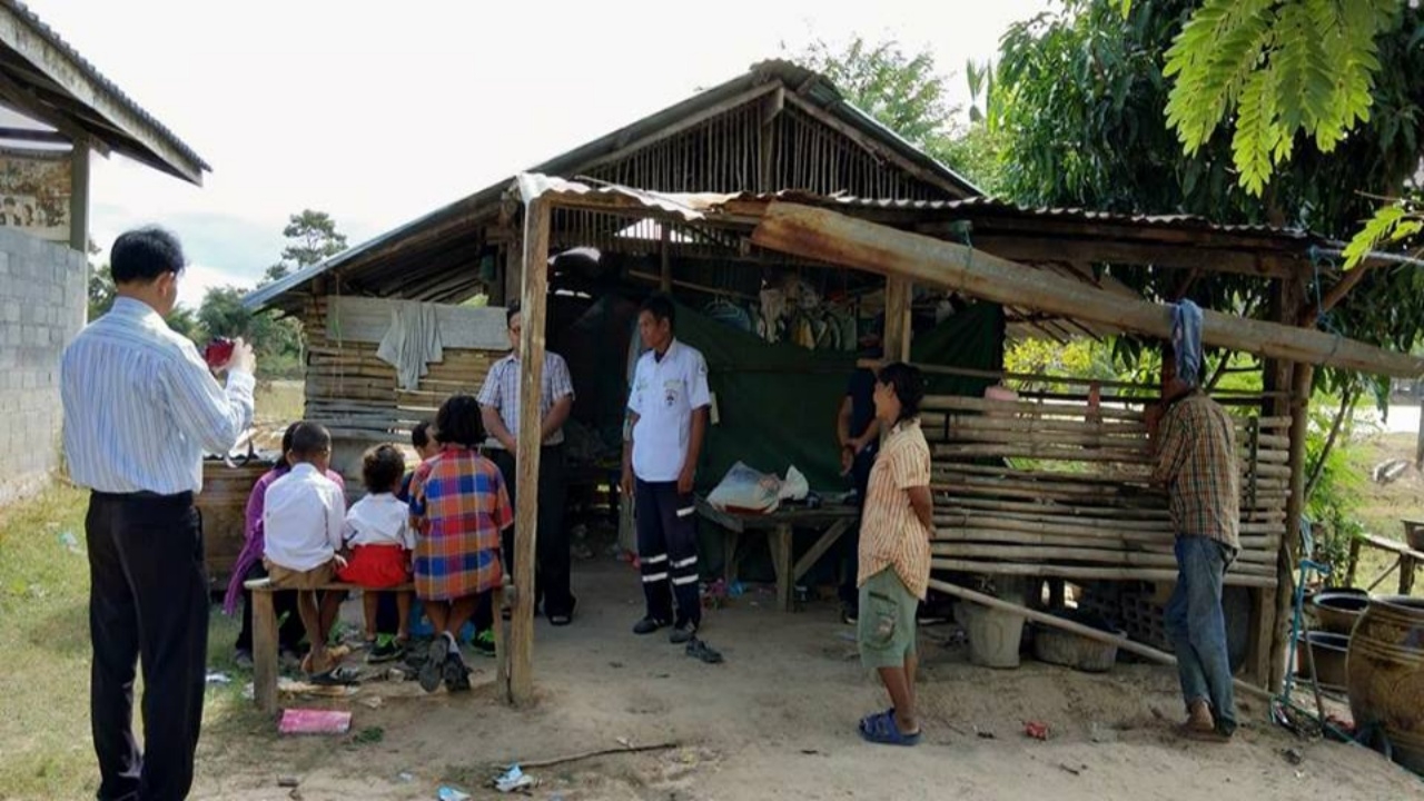 วันที่ 22 พ.ย.60 เมื่อเวลา 17.00 น. ว่าที่ร้อยตรี วินัย เกียรติกำจร ปลัด อบต.โคกขมิ้น อ.พลับพลาชัย จ.บุรีรัมย์ พร้อมด้วยเจ้าหน้าที่ และผู้นำชุมชนบ้านหนองอุดม หมู่ 10 ต.โคกขมิ้น ลงพื้นที่ตรวจสอบเพื่อหาแนวทางให้การช่วยเหลือ ครอบครัว 3 หนูน้อย คือ ด.ญ.นพรัตน์ เปรื่องวิชา อายุ 12 ปี เรียนอยู่ชั้น ม.1 โรงเรียนบ้านตาแก ต.โคกขมิ้น ,ด.ช.นพเก้า โสประโคน อายุ 8 ปี เรียนอยู่ชั้น ป. 2 โรงเรียนบ้านตาแก และ ด.ญ.นพนภา โสประโคน อายุ 4 ปี เรียนอยู่ศูนย์พัฒนาเด็กเล็กบ้านลำเดง สังกัด อบต.โคกขมิ้น ที่อาศัยอยู่ตามลำพัง 3 คน ในบ้านพักไม่มีเลขที่ อยู่ริมหนองน้ำของบ้านหนองอุดม ต.โคกขมิ้น ซึ่งเป็นที่ชั่วคราว ใกล้กับบ้านของญาติที่มีฐานะยากจนเช่นกัน ลักษณะเป็นเพิงสังกะสีชั้นเดียว ปลูกติดกับพื้นดิน ขนาดประมาณ 5 X 7 เมตร โดยด้านข้างใช้สังกะสีตีเป็นฝาผนัง พอแต่กันแดดฝนได้ ส่วนด้านหน้าของตัวบ้านใช้ไม้ไผ่ตีเป็นฝาผนัง และทำเป็นประตูเข้า-ออก อยู่ในสภาพทรุดโทรมมาก อีกทั้งไม่มีห้องสุขาไว้สำหรับปลดทุกข์ และไม่มีไฟฟ้าใช้ภายในบ้าน โดยสภาพภายในบ้านพบมีเครื่องครัวอยู่จำนวนหนึ่ง เสื้อผ้า ที่นอน หมอน มุ้ง อยู่ในสภาพกระจัดกระจาย