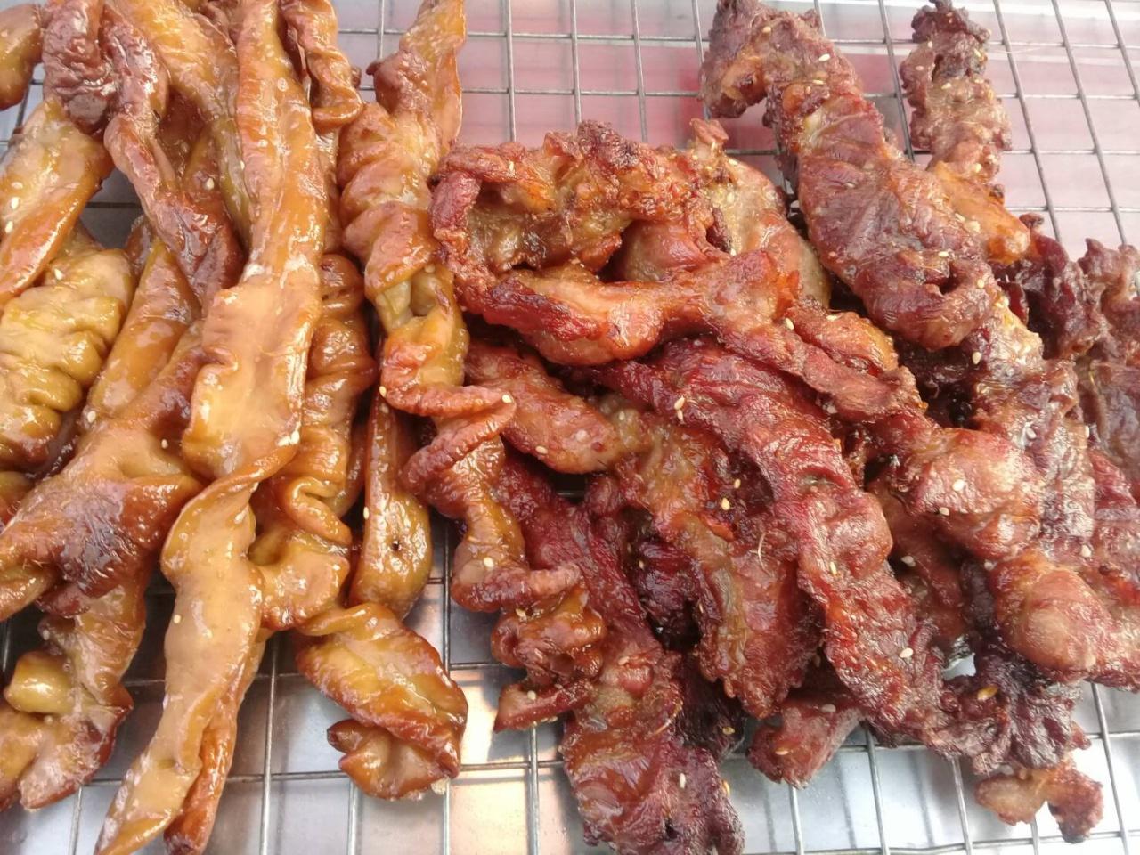 พ่อค้าขายคอหมูอบโอ่งมังกรสูตรหมักสมุนไพร ตลาดนัดคลองถม อ.หนองหาน อุดรธานี เผยขายดีขายได้วันละ 30 กิโลกรัม ลูกค้าติดใจแห่ซื้อต่อคิวยาว ทำรายได้วันละ 5 พันบาท...
