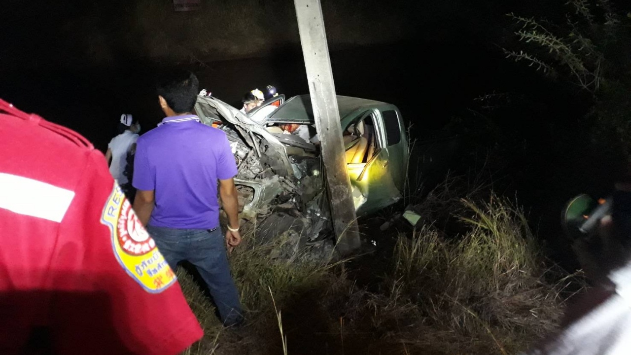 เมื่อเวลา 19.30 น.วันที่ 28 พ.ย. ร.ต.อ.พยุงศักดิ์ ยังกลาง รอง สว.(สอบสวน) สภ.บัวใหญ่ จ.นครราชสีมา ได้รับแจ้งจากศูนย์วิทยุบัวใหญ่ มีรถยนต์กระบะ แหกโค้งชนเสาไฟฟ้าข้างทาง ถนนทางหลวงชนบท ก่อนถึง อบต.โนนทองหลาง อีก 3 กม. คนขับติดคาซาก รถยนต์พังยับเยิน จึงแจ้งให้ พ.ต.อ.คารม บุญสด ผกก.สภ.บัวใหญ่ ทราบ พร้อมด้วยชุดกู้ภัยบัวใหญ่ มูลนิธิคุณธรรมการกุศลบัวใหญ่"เต็กก่า" จีหลักเกาะ ไปยังที่เกิดเหตุ