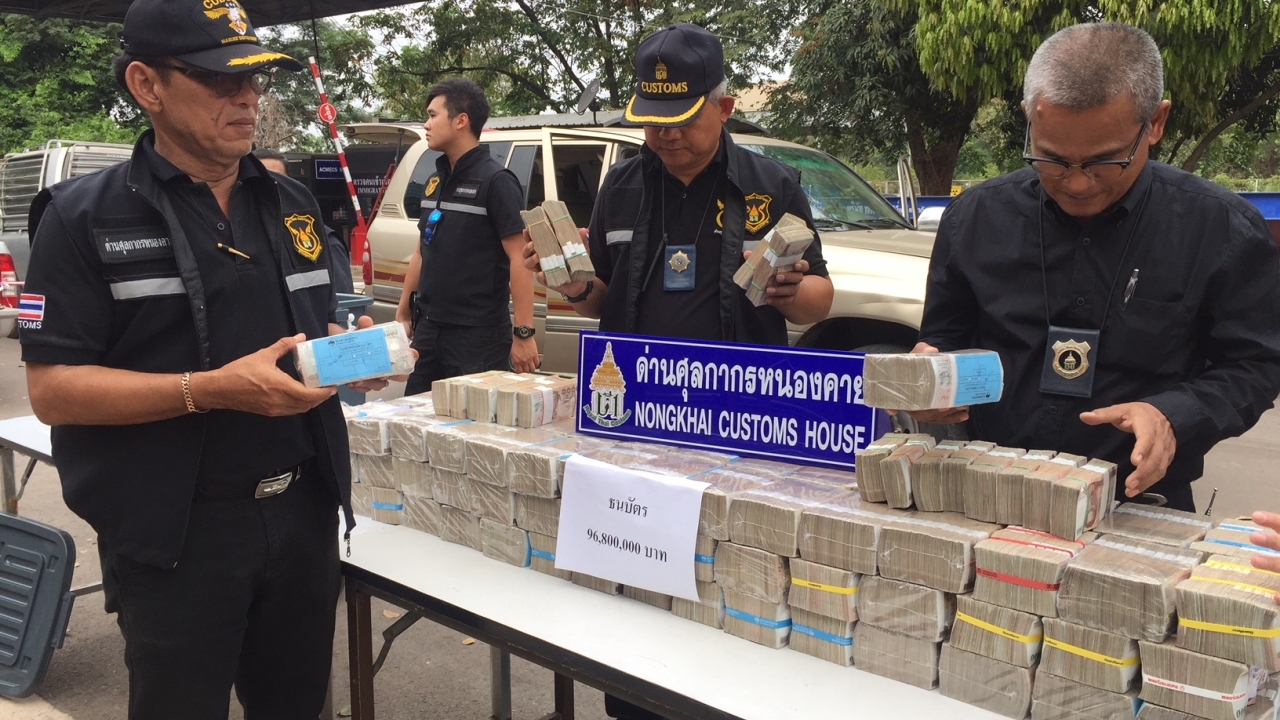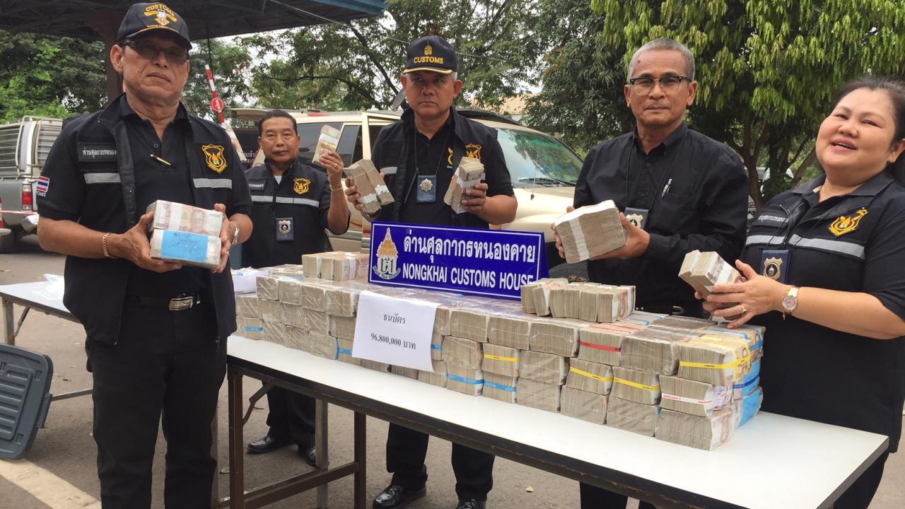 เมื่อเวลา 13.00 น. วันที่ 12 ธ.ค.60 ที่ด่านพรมแดนสะพานมิตรภาพไทย – ลาว แห่งที่ 1 อ.เมืองหนองคาย ขณะที่ นายนิมิตร แสงอำไพ นายด่านศุลกากรหนองคาย พร้อมเจ้าหน้าที่ศุลกากรปฏิบัติหน้าที่ตามปกติ ได้มีรถยนต์โตโยต้า แลนด์ครุยเซอร์ สีทอง ทะเบียนลาว กก 1844 กำแพงนคร มีนายสุบัน เตยสิริ อายุ 30 ปี และนายคำบอน เตยสิริ อายุ 24 ปี สองพี่น้องชาวลาว บ้านอยู่ที่เมืองจันทะบุลี แขวงนครหลวง สปป.ลาว เป็นคนขับและโดยสารมา ซึ่งเป็นรถยนต์ที่ได้รับแจ้งว่ามีการลักลอบกระทำความผิด ได้ยื่นเอกสารและเดินทางออกนอกประเทศไทย กลับประเทศลาว เจ้าหน้าที่จึงได้ขอตรวจค้น พบว่าภายในรถมีกล่องนมวางอยู่เบาะหลังหลายกล่อง แต่เมื่อเปิดดูพบว่าภายในกล่องนมมีธนบัตรฉบับละ 1,000 บาท เป็นมัด ใช้กล่องนมปิดทับด้านบนไว้ เห็นเป็นที่ผิดสังเกต จึงตรวจค้นรถอย่างละเอียด ก็พบธนบัตรฉบับละ 1,000 บาท เป็นมัดซุกซ่อนกระจัดกระจายไว้รอบคันรถ แม้แต่ในห้องเครื่องรถยนต์ก็บรรจุธนบัตรไว้ในกระเป๋าผ้ายีนส์ และตามซอกต่างๆ ของรถ รวมแล้ว 98 ล้านบาท