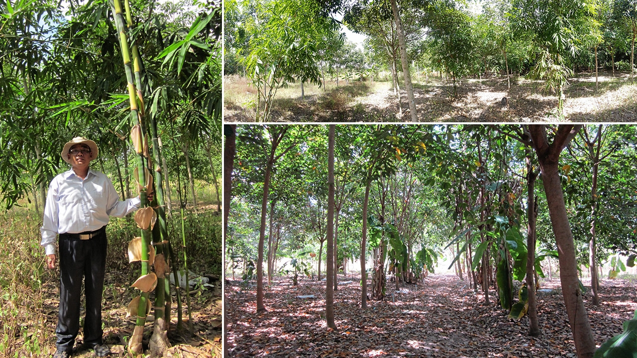 “เกษตรกรส่วนใหญ่มักคิดว่า ไผ่ไม่มีทางอยู่ร่วมกับสวนยางพาราได้ ปี 2555 จึงลงทุนซื้อที่ดิน 21 ไร่ วางแผนสร้างสวนยางพาราแบบไร่นาสวนผสม เป็นสวนยาง 15 ไร่ ทำนา 3 ไร่ และบ่อน้ำอีก 3 ไร่ เริ่มด้วยปลูกพืชตระกูลถั่วเป็นพืชคลุมดิน เพื่อควบคุมวัชพืชและช่วยรักษาความชื้นในฤดูแล้ง ลงกล้ายางใหญ่ และปลูกไผ่กิมซุง หรือไผ่ตงลืมแล้งไปพร้อมกัน ในระหว่างร่องยางอีก 300 กอ ไม่เห็นมีปัญหาอะไร ยางก็เติบโตได้ดีเหมือนปกติ ไผ่ก็เช่นกัน ปีเดียวให้หน่อไว้กินไว้ขายได้ทุกๆเดือน”