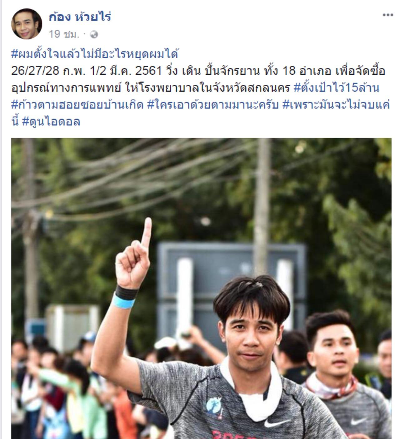 ก้อง ห้วยไร่ ประกาศวิ่ง เดิน ปั่นจักรยาน ทั้ง 18 อำเภอของสกลนครเพื่อหาเงินช่วยจัดซื้ออุปกรณ์ทางการแพทย์ รพ.บ้านเกิด ตั้งเป้า 15 ล้านบาท ดีเดย์ 26 ก.พ.-2 มี.ค. 61 นี้...