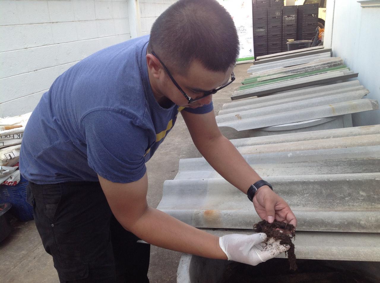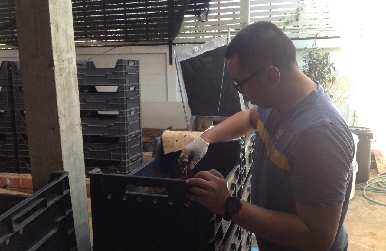พ.ต.ท.สันติภาพ สายงาม เผยว่า ตนเริ่มเลี้ยงไส้เดือนมาได้ประมาณ 1 ปีแล้ว ที่สนใจเลี้ยงเพราะต้องการปุ๋ยธรรมชาติที่มีคุณภาพมาไว้ใส่ต้นไม้ในบ้าน เมื่อศึกษาก็พบว่ามูลไส้เดือนเป็นปุ๋ยธรรมชาติที่มีคุณภาพสูง เลี้ยงไม่ยุ่งยาก ใช้พื้นที่น้อย และไส้เดือนยังช่วยย่อยเศษอาหารพืชผักเหลือทิ้งภายในบ้านได้ด้วย ตนจึงเริ่มซื้อไส้เดือนพันธุ์เอเอฟ ตัวละ 1 บาท จำนวน 5,000 ตัว มาเลี้ยงในมูลวัวและเศษหัวเชื้อเห็ดที่เหลือทิ้ง มีเศษผักเศษอาหารเหลือทิ้งในครัวเรือนเป็นอาหารให้ไส้เดือนกิน โดยตอนแรกเลี้ยงในกะละมัง และบล็อกปูนซีเมนต์หลังบ้าน กระทั่งไส้เดือนขยายพันธุ์เพิ่มจำนวนมากขึ้น แต่พื้นที่มีจำกัดจึงใช้กระบะพลาสติกทำเป็นคอนโดเลี้ยงแทน ซึ่งประหยัดพื้นที่ และไส้เดือนก็ยังให้มูลได้ตามปกติ