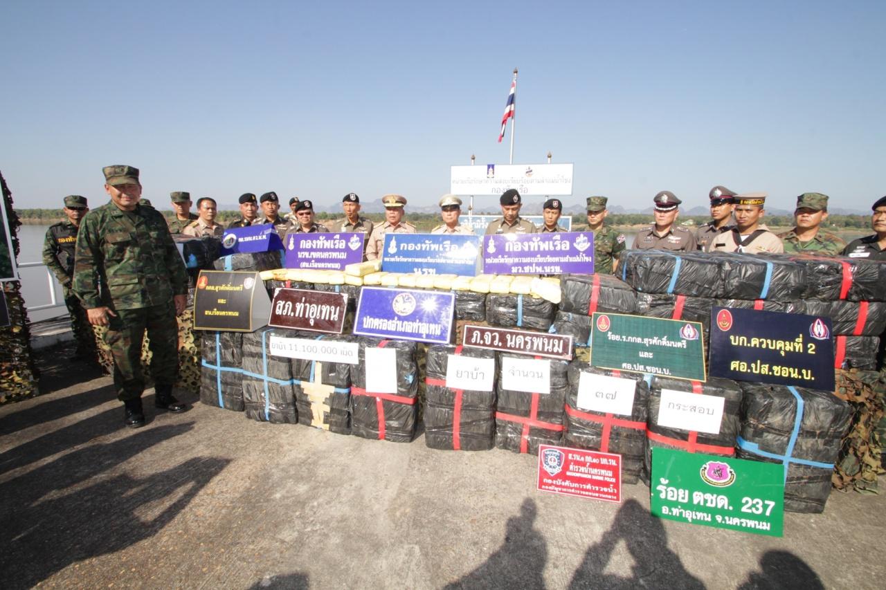 เมื่อเวลา 14.30 น. วันที่ 23 ม.ค.61 ที่กองบัญชาการหน่วยเรือรักษาความสงบเรียบร้อยตามลำแม่น้ำโขงนครพนม (นรข.) พลเรือโทชาติชาย ศรีวรขาน รองเสนาธิการทหารเรือ พร้อมด้วย นายสมชาย วิทย์ดำรงค์ ผวจ.นครพนม พลเรือตรี พิสิษฐ์ ทองดีเลิศ ผู้บัญชาการหน่วยเรือรักษาความสงบเรียบร้อยตามลำแม่น้ำโขง นครพนม พล.ต.ท.สุรชัย ควรเดชะคุปต์ ผบช.ภ.4 พล.ต.ต.สุวิชาญ ญาณกิตติกุล ผบก.ภ.จว.นครพนม ร่วมกับเจ้าหน้าที่ปฏิบัติการปราบปราบยาเสพติด นรข.นครพนม แถลงการณ์จับกุม ขบวนการค้ากัญชาชาวลาว อายุ 17 ปี จำนวน 1 คน พร้อมของกลางยาบ้า จำนวน 11,100,000 เม็ด(สิบเอ็ดล้านหนึ่งแสนเม็ด) มูลค่าของกลางมากกว่า 3,000 ล้านบาท