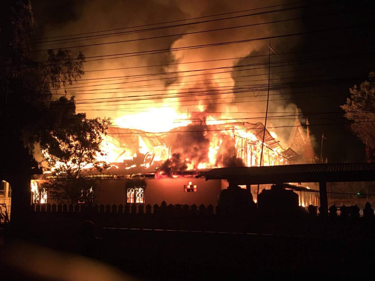 เมื่อคืนนี้พระภิกษุและช่างก่อสร้างวิหารหลวงพ่อพระบาง ได้ขึ้นไปนอนบนศาลาชั้น 2 ขณะกำลังนอนหลับ ก็ได้กลิ่นเหม็นไหม้พร้อมมีควันลอยลงมาจากเพดาน พระและช่างก่อสร้างได้วิ่งลงมาจากศาลา พร้อมกับร้องตะโกนบอกพระในวัดซึ่งมี 7 รูป พร้อมกับตีระฆังแจ้งชาวบ้านให้มาช่วยกัน แต่เพลิงลุกไหม้รวดเร็วมาก จึงดับไม่ทัน อีกทั้งรถดับเพลิงที่มาคันแรกไม่มีน้ำ ต้องไปเติมน้ำ ทำให้ศาลาไหม้หมดทั้งหลัง