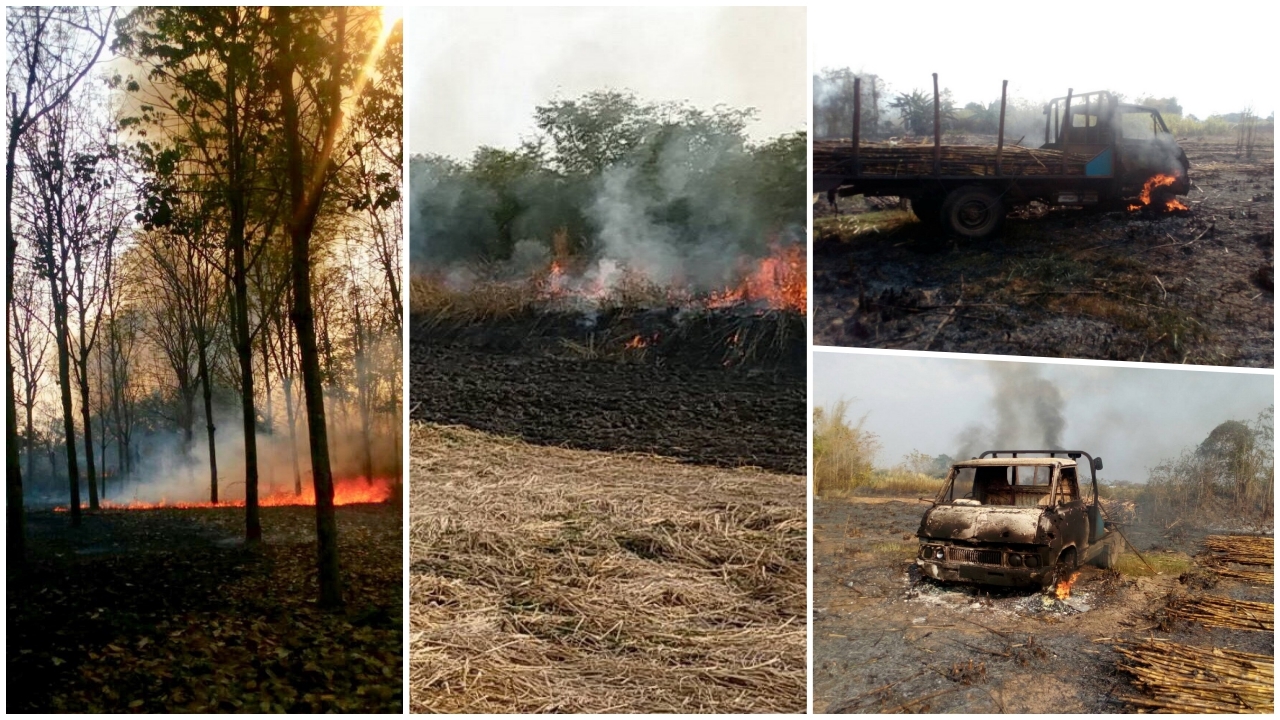 จากการสอบสวนนายอุดม เริงโพธิ์ อายุ 37 ปี อยู่บ้านเลขที่ 94 หมู่ 16 ต.โคกขมิ้น อ.วังสะพุง จ.เลย เล่าว่า ขณะที่ตนเองและคนงานกำลังตัดอ้อยเพื่อไปส่งโรงงาน เห็นเปลวไฟพวยพุ่งไหม้ป่าอ้อยที่ห่างออกไปประมาณ 100 เมตร จึงช่วยกันดับไฟ แต่ด้วยอากาศที่ร้อนแห้ง และอ้อยเป็นเชื้อเพลิงอย่างดี และมีกระแสลมแรงทำให้ไฟลุกไหม้อย่างรวดเร็วลามมาติดรถหกล้อที่จอดอยู่จนไหม้ทั้งคัน จนมีรถน้ำดับเพลิงมาฉีดน้ำสกัดไว้ได้ ส่วนค่าเสียหายป่าอ้อยกว่า 50 ไร่ รถหกล้อ คาดว่าความเสียหาย 5-6 แสนบาท.