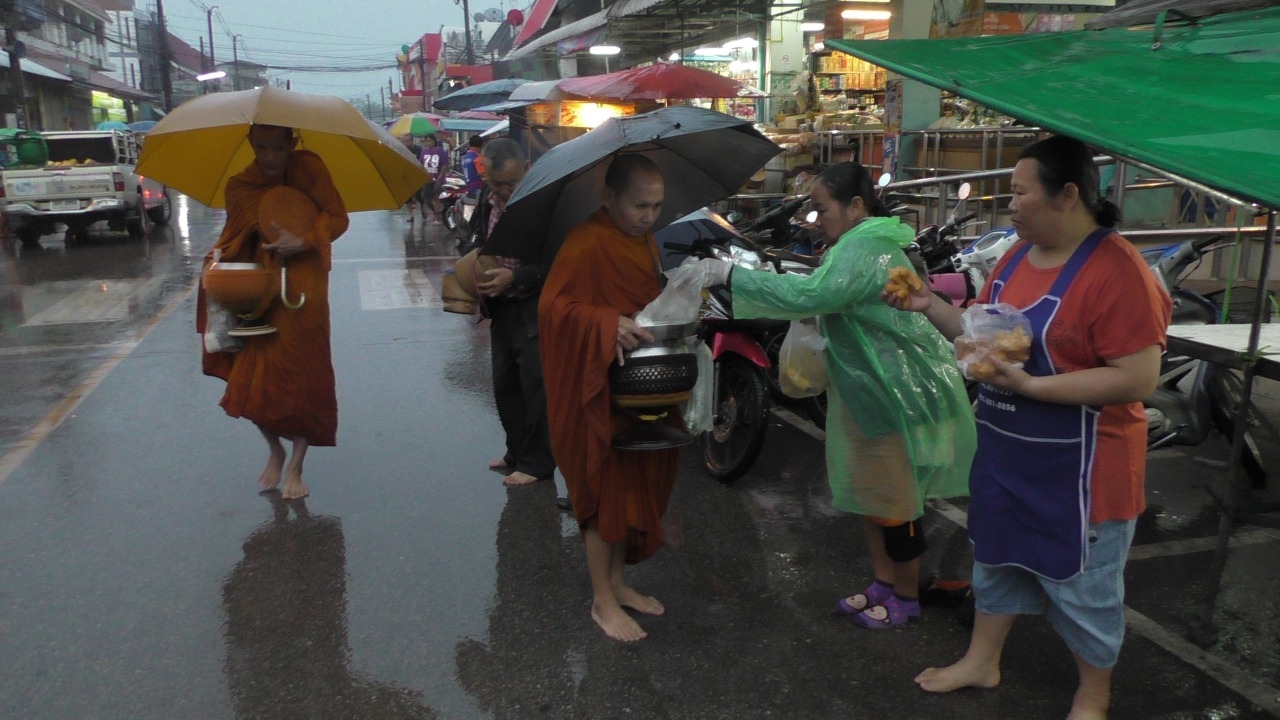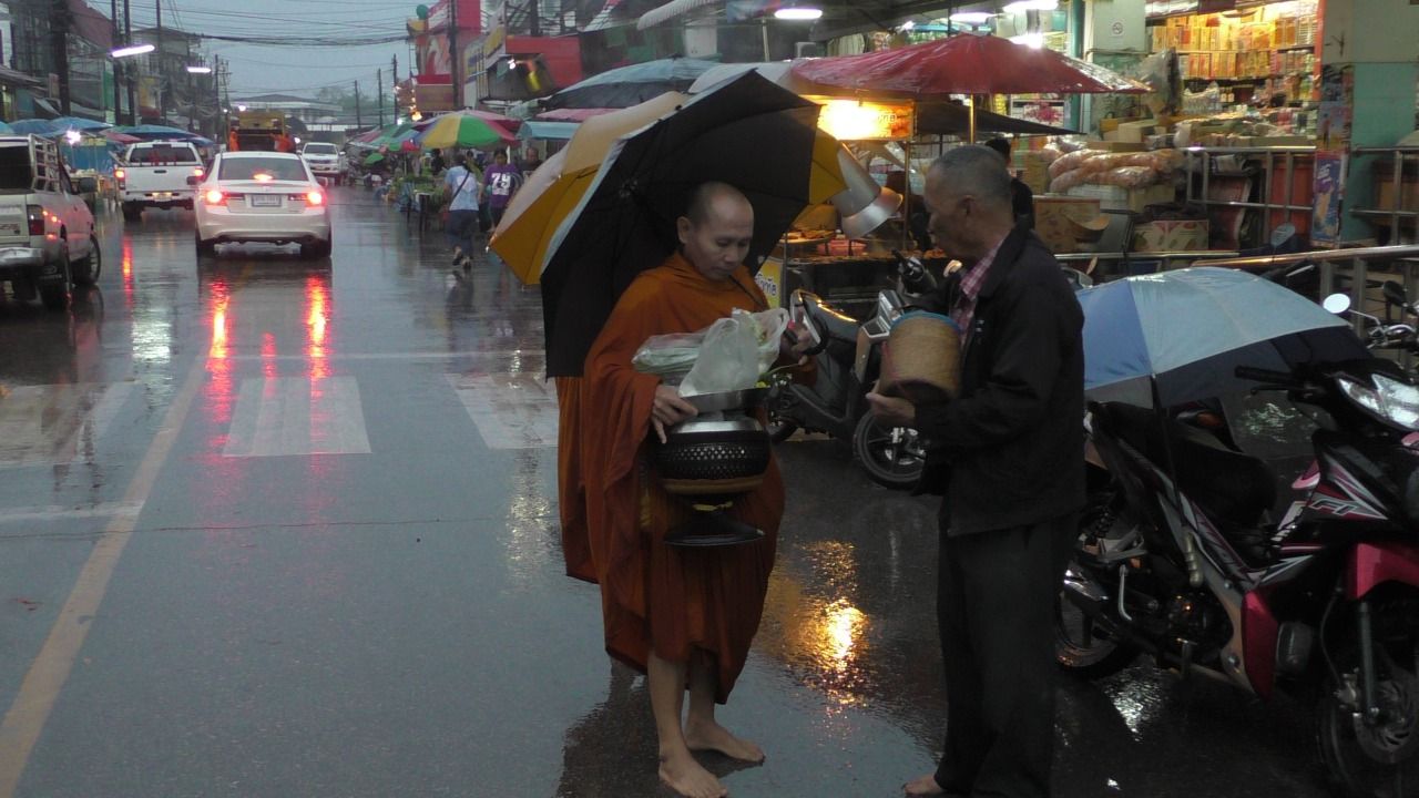 บึงกาฬฝนตกแต่เช้า ทำให้ช่วยลดอุณหภูมิของอากาศที่ร้อนได้ผ่อนคลายลง ขณะที่ พระบิณฑบาตต้องเดินรับบาตรท่ามกลางสายฝน...