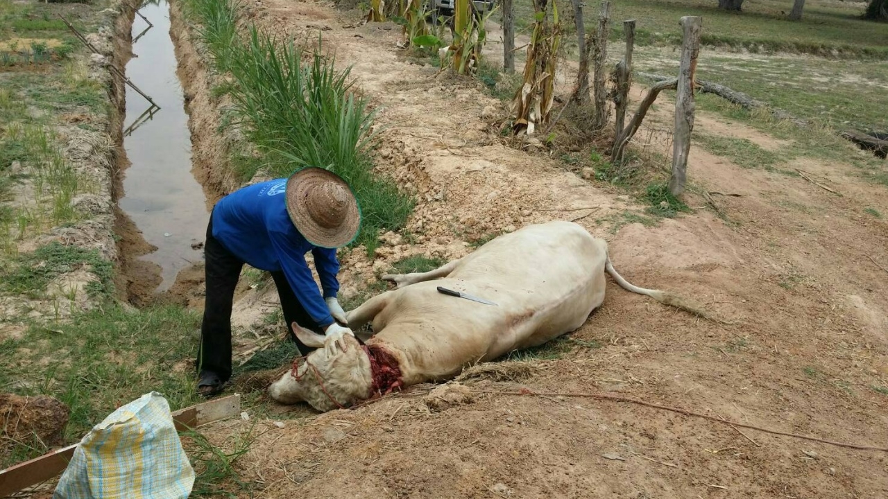 นายถวัลย์ โชติช่วง กล่าวว่า วัวที่ตายเป็นวัวพันธ์ ชาร์โรเล่ส์ สีขาว อายุ 2 ปีครึ่ง ซื้อมาจากบ้านแกใหญ่ อำเภอเมืองสุรินทร์ นำมาเป็นพ่อพันธ์ ซื้อมาเมื่อ 3 เดือนที่แล้ว ในราคา 5 หมื่น 5 พันบาท จนเมื่อวันที่ 21 มีนาคม ที่ผ่านมา วัวมีอาการซึม น้ำมูกไหล ไม่กินอาหาร จึงแจ้งทางปศุสัตว์อำเภอเมืองให้นายสัตวแพทย์มาฉีดยา แก้ไข้ แก้อักเสบ แก้เท้าเปื่อย และให้ยาไว้ฉีด จนวันที่ 25 มี.ค. วัวมีอาการไม่ดีจึงเอายาที่สัตวแพทย์ให้ไว้มาฉีดอีกครั้ง อาการไม่ดีขึ้นวัว มีอาการชัก ล้มลง น้ำลายไหลฟูปาก วัวตัวนี้ไม่มีบาดแผล หรือถูกหมากัด แต่อย่างใด จากนั้นได้แจ้งทางปศุสัตว์มาดู แต่ปศุสัตว์แจ้งให้ตัวหัวเอาไปตรวจเอง ตนเองรู้สึกไม่ค่อยพอใจที่ได้รับคำตอบเช่นนี้ จึงให้ผู้ใหญ่บ้านติดต่อทางปศุสัตว์อำเภอ ระหว่างนี้เอารถไถลากวัวออกจากคอก ไปทุ่งนาเพื่อเตรียมขุดหลุมฝัง เมื่อปศุสัตว์มาให้ตนเองลงมือตัดหัววัวที่ตายส่งไปที่ พิสูจน์ที่ศูนย์วิจัยและพัฒนาการสัตวแพทย์ภาคตะวันออกเฉียงเหนือตอนล่าง จังหวัดสุรินทร์ ส่วนตัววัวก็เอาไปฝัง
