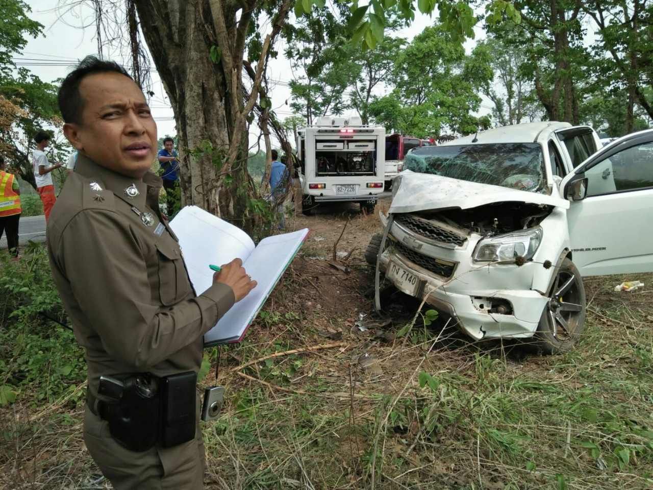 ในที่เกิดเหตุ พบรถยนต์เชฟโรเลต สีขาว ทะเบียน กง 7140 ชัยภูม ชนติดกับต้นไม้ ริมถนนด้านซ้ายมือ ฝั่งมุ่งหน้าไปทางบ้านหนองบัวโคก ขาออกมาจาก จ.นครราชสีมา โดยมี นางวิไล สบกลาง 46 ปี อยู่บ้านเลขที่ 12 ม.11 ต.บึงปรือ อ.เทพารักษ์ จ.นครราชสีมา สวมเสื้อยืดสีฟ้า กางเกงยีนส์ ติดอยู่ในรถตรงจุดที่นั่งคนขับ มีเข็มขัดนิรภัยรัดตัวอยู่ มีข้าวหลามกระบอกไม้ไผ่ 2 กระบอก วางอยู่บนขาซ้ายนางวิไล โดยพลเมืองดีใช้พัดช่วยกันพัด ขณะที่เจ้าหน้าที่ใช้เครื่องตัดถ่างตัดแยกตัวรถประมาณ 30 นาที จึงสามารถนำร่างออกมาได้