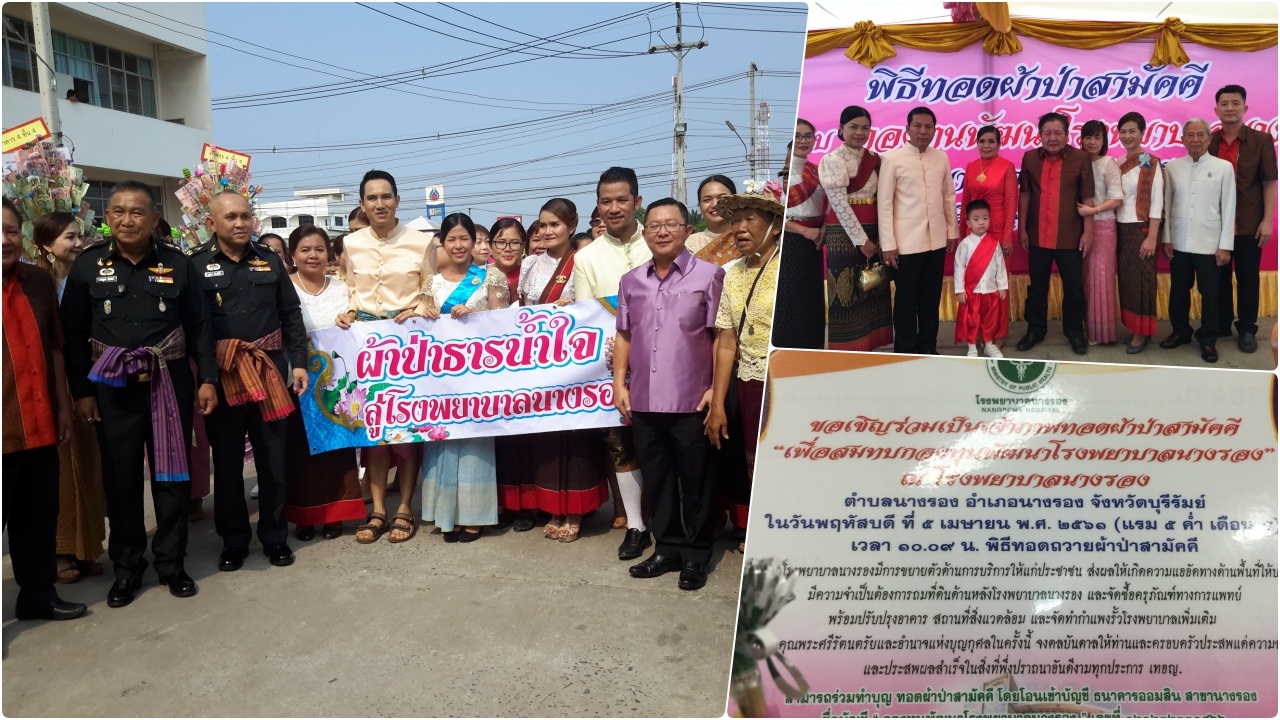 วันที่ 5 เม.ย. 61 ผู้สื่อข่าวประจำอำเภอนางรอง จ.บุรีรัมย์ รายงานข่าวการทอดผ้าป่าสามัคคี เพื่อสมทบทุนสร้างโรงพยาบาลนางรอง โดยมี พล.ท.เดชอุดม นิชรัตน์ ผู้ทรงคุณวุฒิพิเศษ กองทัพบก พล.ต.ยุทธนา เอี่ยมวิจิตร์ ผบ.มทบ.26 นายยุทธนา พิทยานันทกุล นายอำเภอนางรอง นายแพทย์วิทิต สฤษฎีชัยกุล นายแพทย์สาธารณสุข จ.บุรีรัมย์ นายแพทย์จรัญ ทองทับ ผอ. รพ.บุรีรัมย์ นายแพทย์วัชรพงษ์ ขอบสุข ผอ.รพ.นางรอง นาพแพทย์นพดล พิษณุวงษ์ รอง ผอ.รพ.นางรอง และข้าราชการทุกหน่วย พ่อค้าประชาชน ร่วมงาน