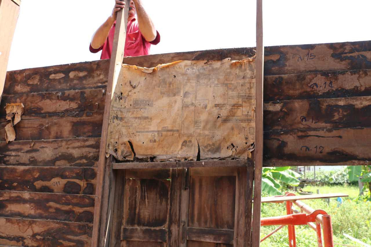 ส่วนภายในบ้านอยู่ระหว่างช่างกำลังรื้อถอนไปกว่า 50 เปอร์เซ็นต์แล้ว พบว่าเป็นไม้บ้านเก่าไม้เต็งทั้งหลัง ในพื้นที่ 1 งาน ชั้นบนมี 2 ห้องนอน และห้องโล่ง ข้างล่าง 1 ห้องนอนและห้องโล่ง ยังพบตู้เสื้อผ้าไม้เก่าอายุกว่า 100 ปี ที่มีการแกะไม้สัญลักษณ์ธงชาติไทยและดาวคว่ำหัว