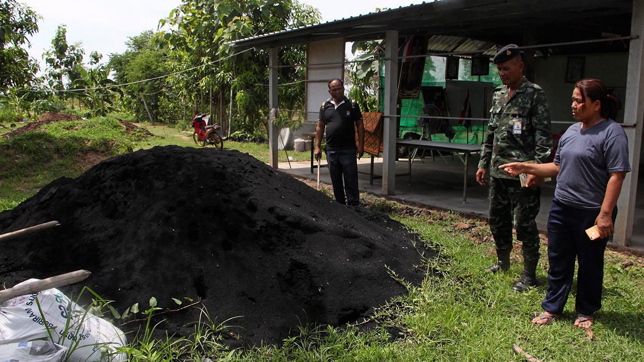 นางหลิ่ง พรชัย ประธาน ศพก.อ.ปรางค์กู่ จ.ศรีสะเกษ ชี้กองแกลบดำที่เกษตรอำเภอปรางค์กู่ส่งมาให้พร้อมกับปุ๋ยมูลวัว 200 กระสอบ แผ่นป้ายไวนิล และแก้วน้ำ จัดซื้อจากเงินงบประมาณพัฒนา ศพก. 1 แสนบาท.