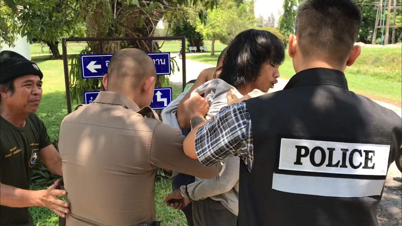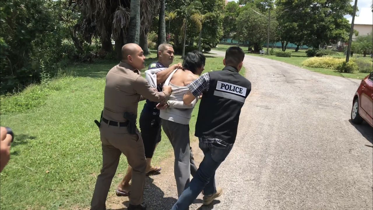 เจ้าหน้าที่ตำรวจจึงหว่านล้อมให้ยอมมอบตัว แต่หนุ่มคลั่งกลับพูดจาวกวนไม่รู้เรื่องและแสดงอาการก้าวร้าวชูอาวุธสนับมือข่มขู่ตลอดเวลา จนท.จึงอาศัยช่วงจังหวะที่ชายคนดังกล่าวเผลอ เข้ารวบตัวไว้ได้จากด้านหลัง ท่ามกลางความพยายามต่อสู้ขัดขืน และพบเพียงสนับมือตกอยู่ในที่เกิดเหตุโดยไม่พบมีดแต่อย่างใด โดยระหว่างการจับกุม จนท.พยายามสอบถามถึงเด็กชายที่ชายคนดังกล่าวจับตัวมาก็ไม่ได้รับคำตอบใด นอกจากเสียงตะโกนด่าทอตลอดเวลา จนเจ้าหน้าที่ต้องใส่กุญแจมือแล้วรีบนำตัวขึ้นรถไปยังโรงพยาบาลศูนย์สกลนครเพื่อทำการควบคุมตัวไปทำการรักษาทันที