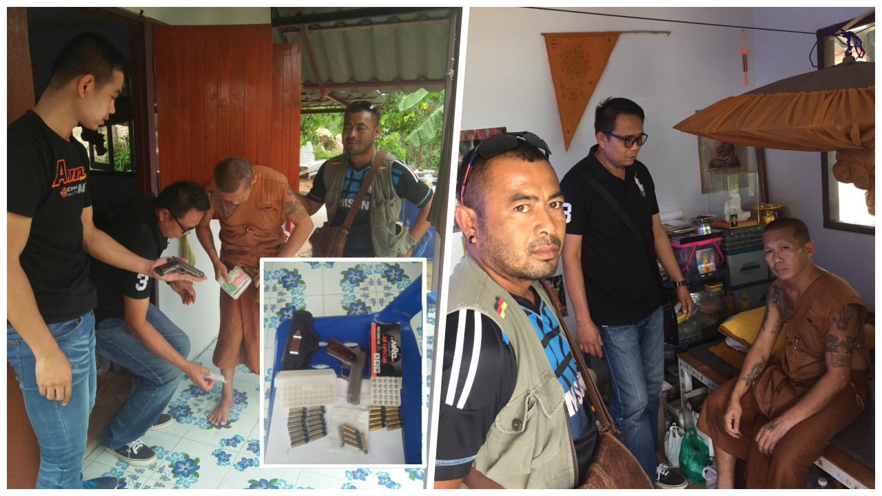 หนุ่มสระบุรี หนีคดีฆ่าคนตายมาบวชเป็นพระ แต่ไม่รอด ตำรวจนำหมายจับตามรวบตัวคาสำนักสงฆ์ พบเหน็บปืนไว้ในสบง ในกุฏิมีกระสุนซุกไว้อีกถึง 30 นัด